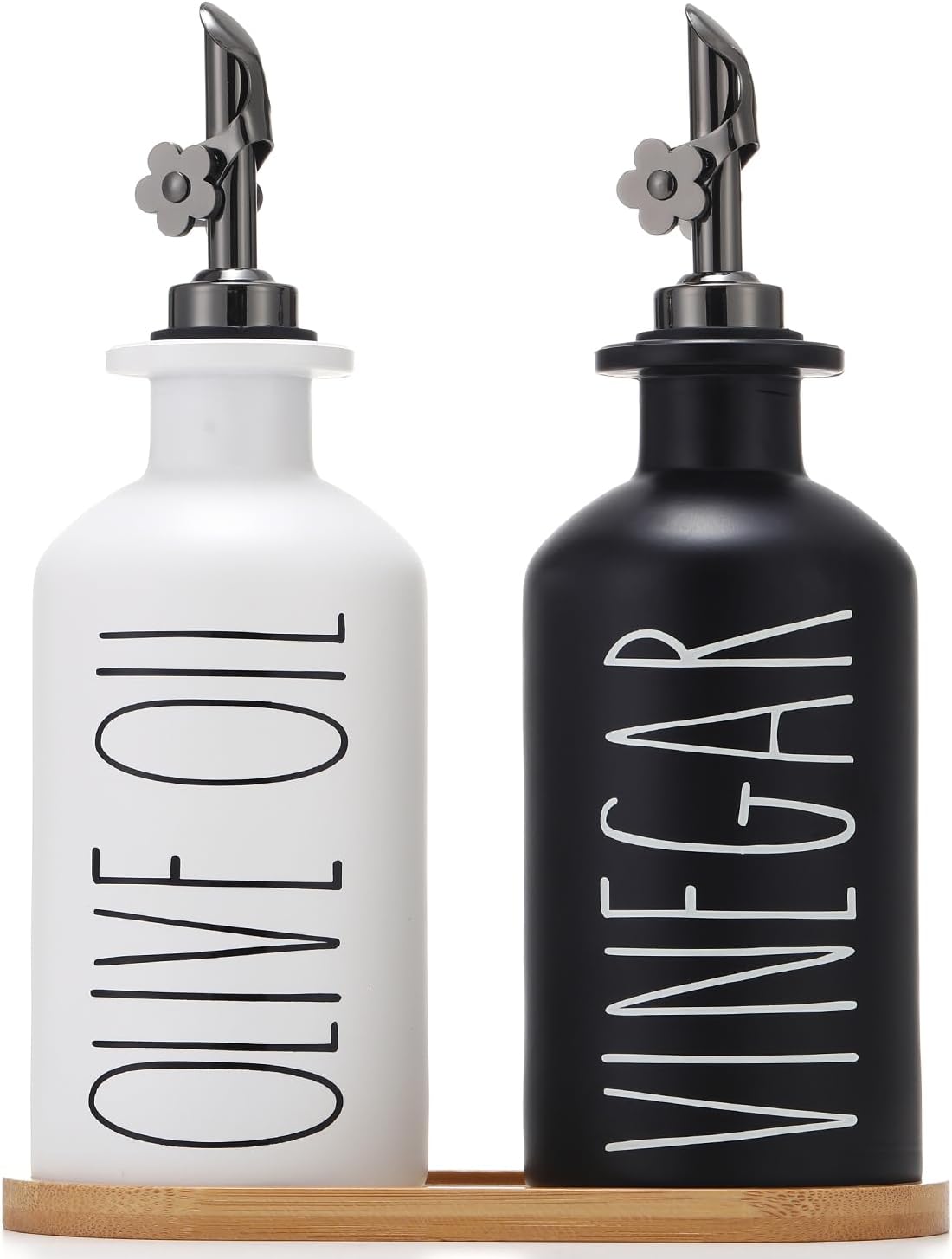 - MODERN FARMHOUSE DESIGN - Worthy of sitting on your kitchen counter, The glass olive oil dispenser printed the beautifully Olive Oil and Vinegar label which can help you identify them easily, both decorative and practical, this vinegar and oil dispenser bottles not only kitchen oil dispenser, but also black and white kitchen décor.
