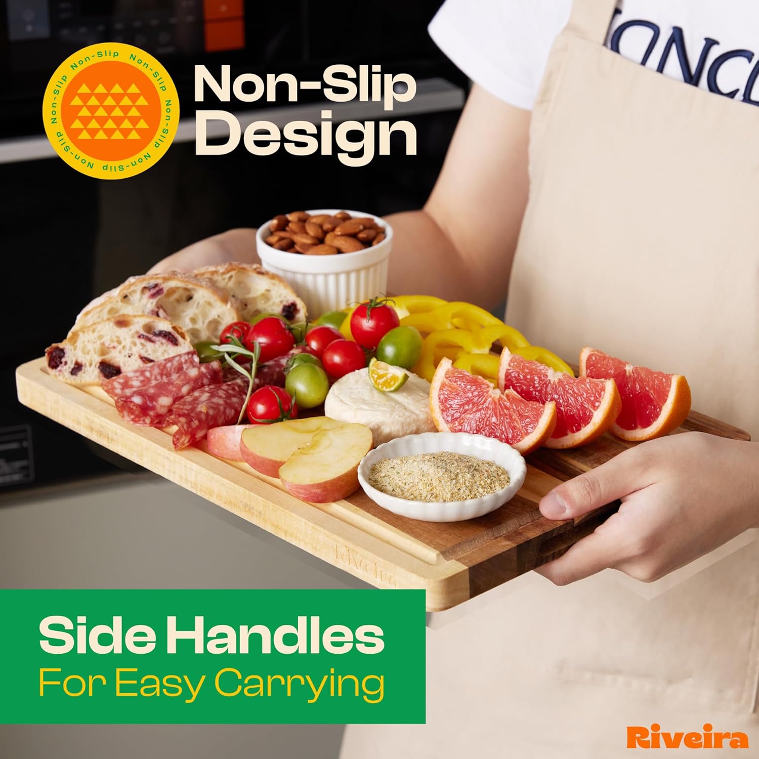 - Premium Crafted Acacia — Take a detour from traditional kitchen aesthetics with this acacia wood board crafted from 100% natural acacia. Beyond being an unconventional and eco-friendly choice, the chopping board wood proudly showcases the environment friendly and organic acacia. This wood cutting boards for kitchen counter adds an unexpected touch of confidence and style to your once-orderly culinary space. Riviera's wooden chopping boards for kitchen will be there for you for many years.