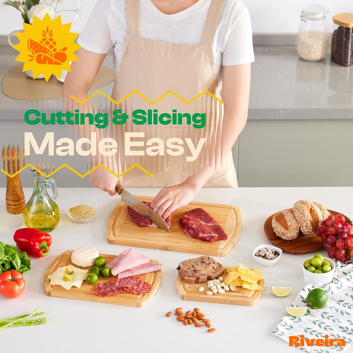 - Premium Crafted bamboo — Take a detour from traditional kitchen aesthetics with this two tone bamboo wood board crafted from 100% natural bamboo. Beyond being an unconventional and eco-friendly choice, the chopping board wood proudly showcases the environment friendly and organic bamboo. This wood cutting boards for kitchen counter adds an unexpected touch of confidence and style to your once-orderly culinary space. Riviera's wooden chopping boards for kitchen will be there for you.