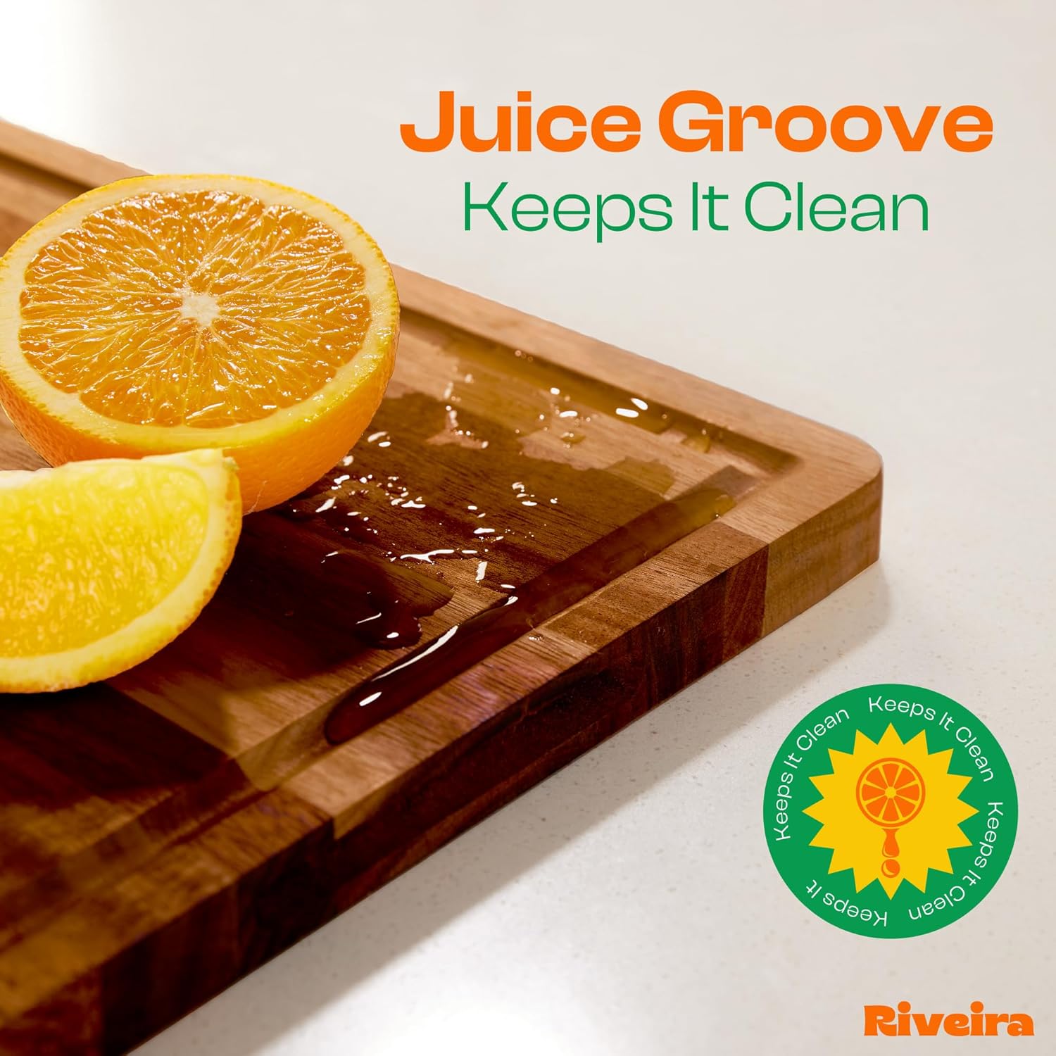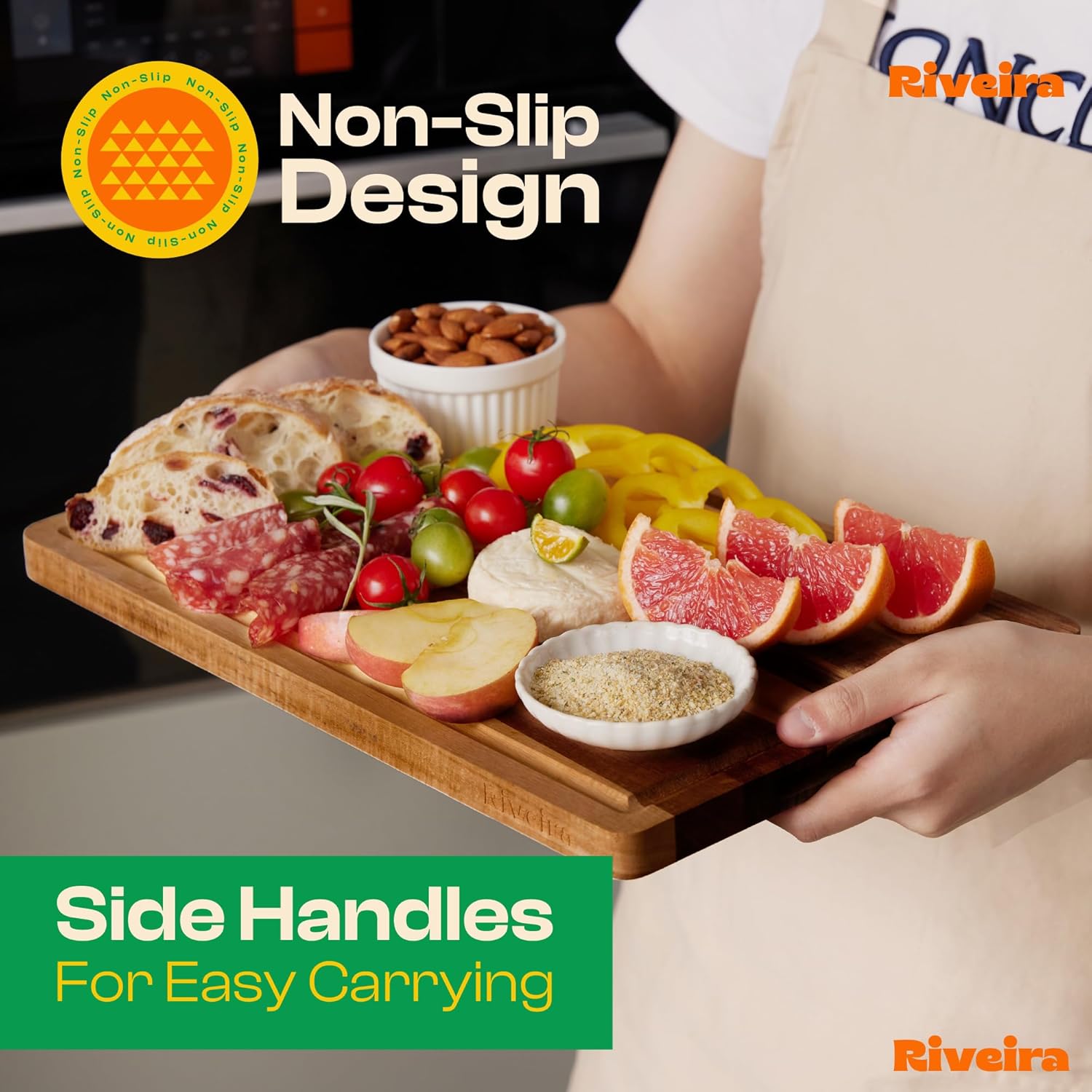 - No Mess Cutting and Transfer — Enjoy a mess-free kitchen with our cutting boards for kitchen decorative. Equipped with deep juice grooves, these wood cutting board large catch liquid runoff from meat, and fruit, preventing spills and countertop messes. Whether you're working in an industrial restaurant kitchen or your home, this best wood cutting board makes cleanup a breeze. Transfer ingredients from your prep station to the stove without any fuss with Riveira wooden cutting board large.