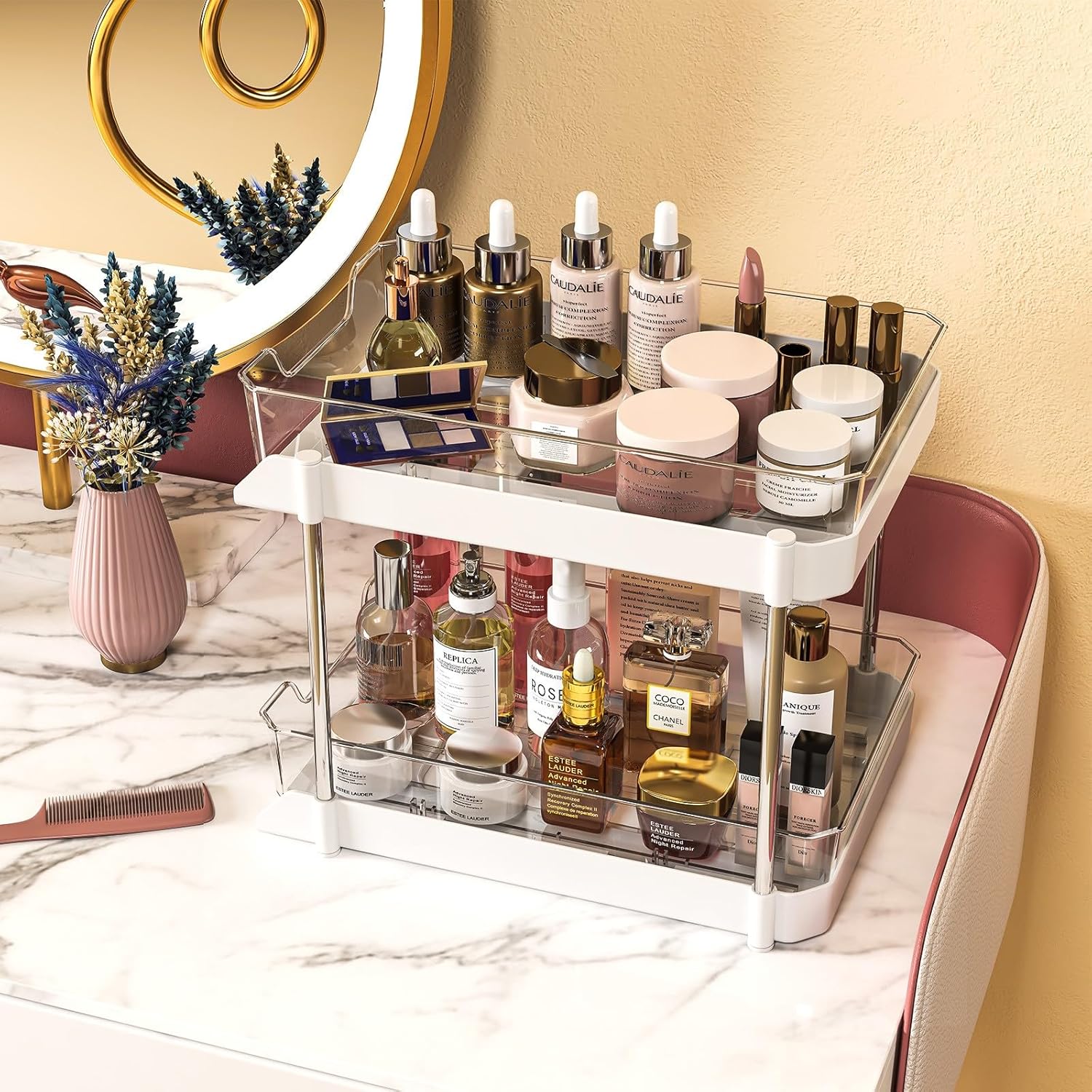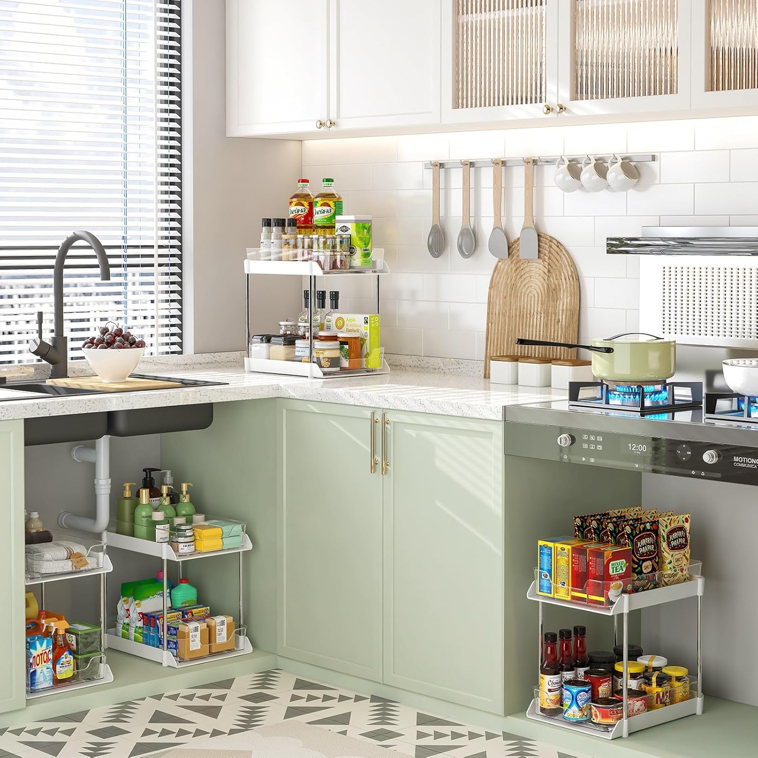 - Storage Space : White&Clear Under sink organizers and storage is spacious enough in two levels maximizes vertical space. The double tier sliding drawers can be pulled out by the handles for easy access to get items behind the front row. Effectively using the entire space of the cabinet.