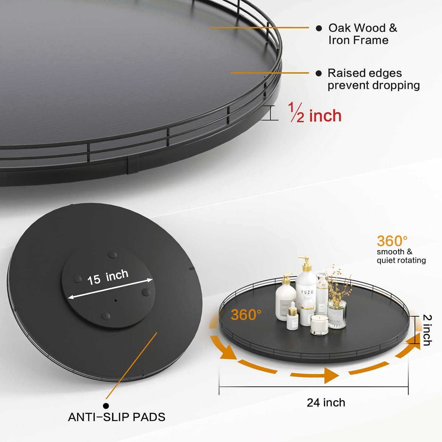 - Thoughtful Design: The turntable tray features a smooth and silent 360°rotation; Bottom slip-resistant pads for stability and protect your countertop from scratches; Raised edges on each organizer tray to keep items from falling out; Easy to use, no installation required