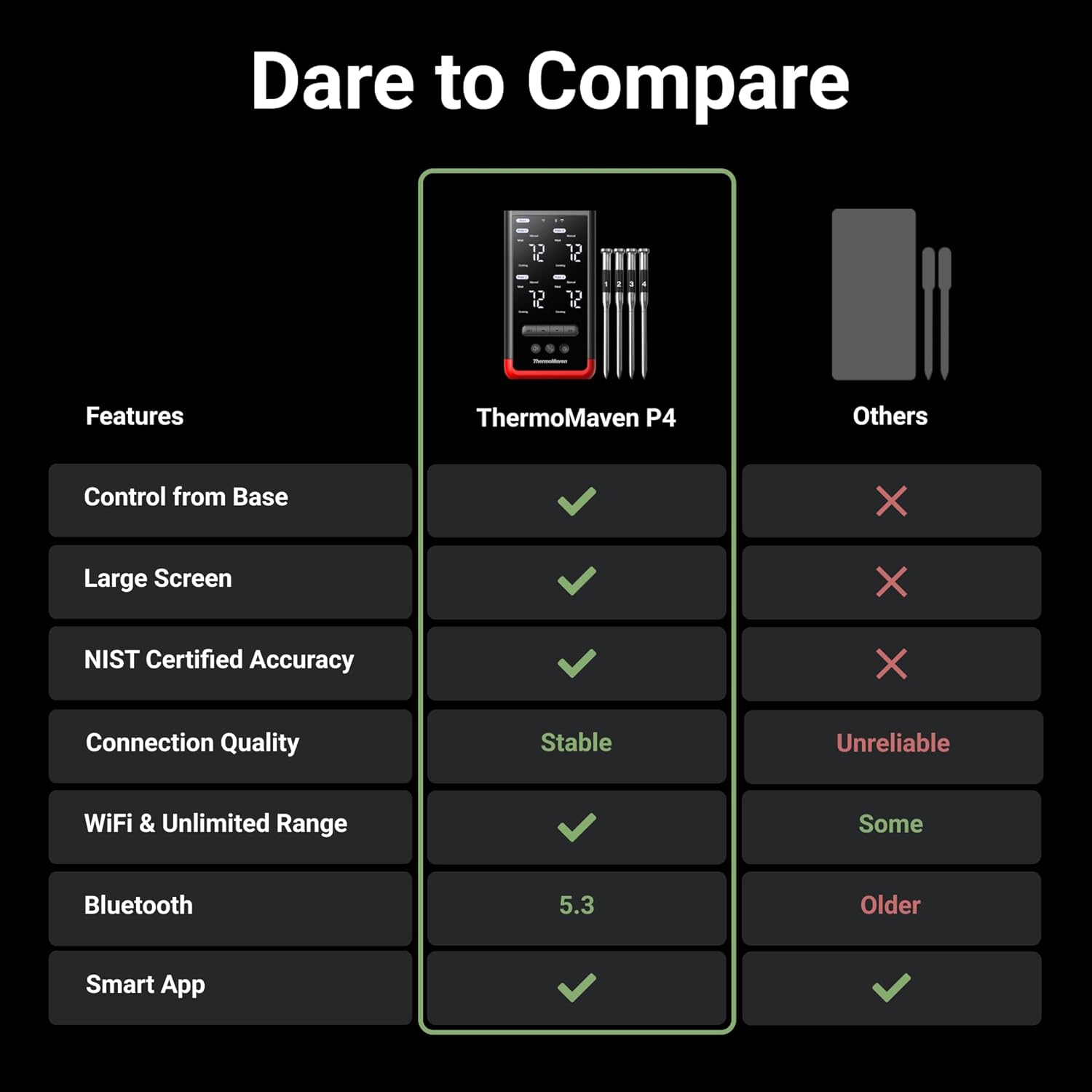 - Unlimited Range via Wi-Fi: Many wireless thermometers are restricted to Bluetooth to connect your phone with the base, but the ThermoMaven P4 features advanced 2.4GHz Wi-Fi connectivity. This lets you monitor your culinary creations from anywhere.