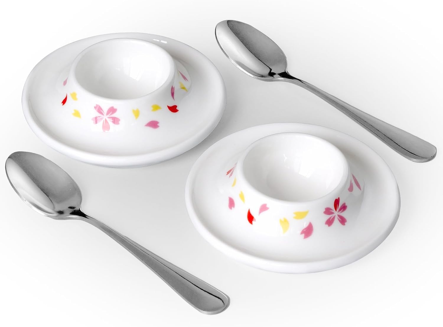Cinf Ceramic Sakura Egg Holder Set of 2 Porcelain Holder With 2 Stainless Steels Egg Spoons Breakfast Boiled Cooking Easy to Clean Childhood Memories Kitchen