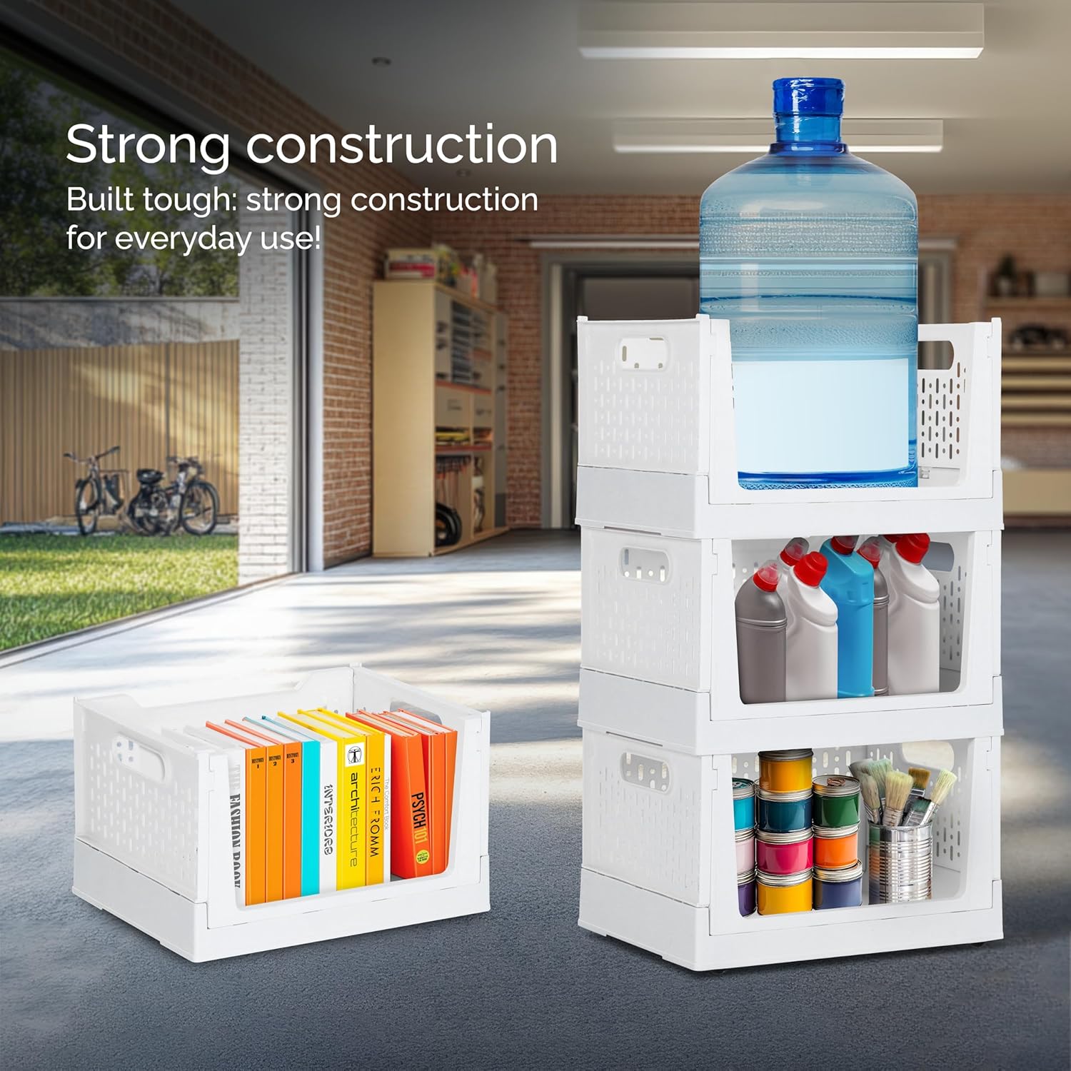- [Space-Saving Design]: Optimize your storage space with stackable and foldable bins. When not in use, simply fold them down to free up space. The generous size accommodates a variety of items, and the snap design on both sides prevents tipping, ensuring your stacked bins stay securely in place.