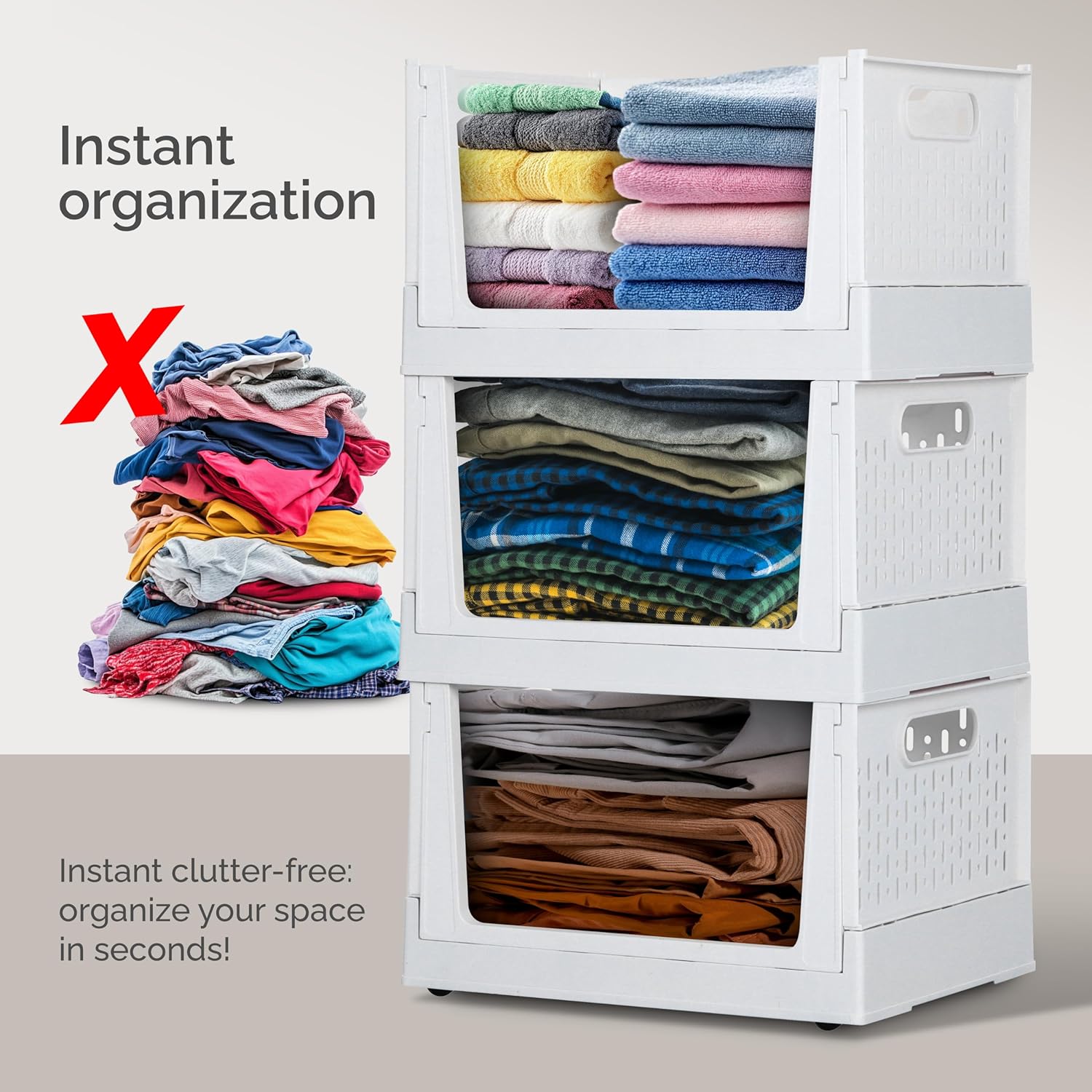 Skywin TidyFriend Stackable Storage Bins with Wheels, 3 Pack Foldable Storage Bins Box, Plastic Shelves Drawer Organizer Container for Closet Office Bedroom Kitchen Bathroom (Ivory)