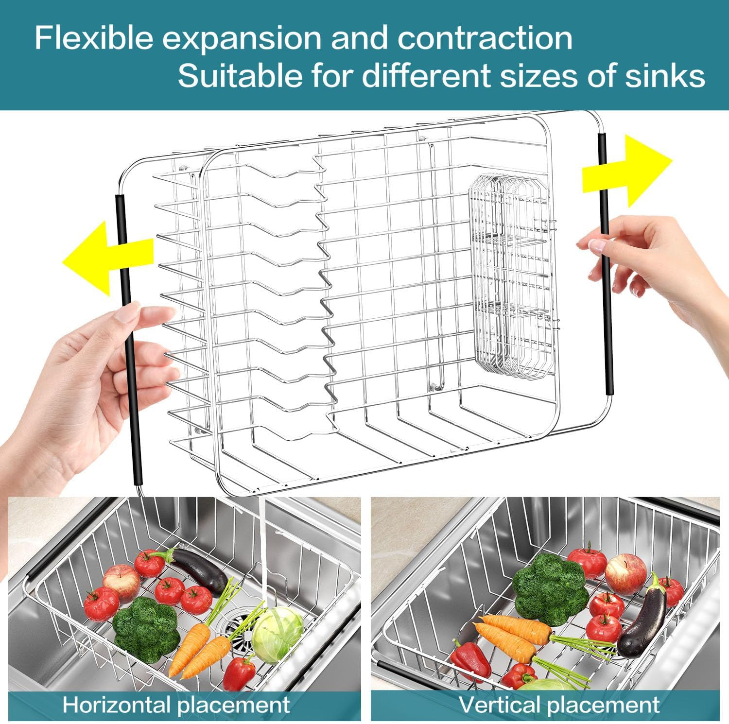 Large Dish Drying Rack in Sink Expandable, Adjustable304 Stainless Steel Metal Dish DrainerRack Organizer with Stainless Steel Utensil Holder Over Inside Sink Counter, Rustproof