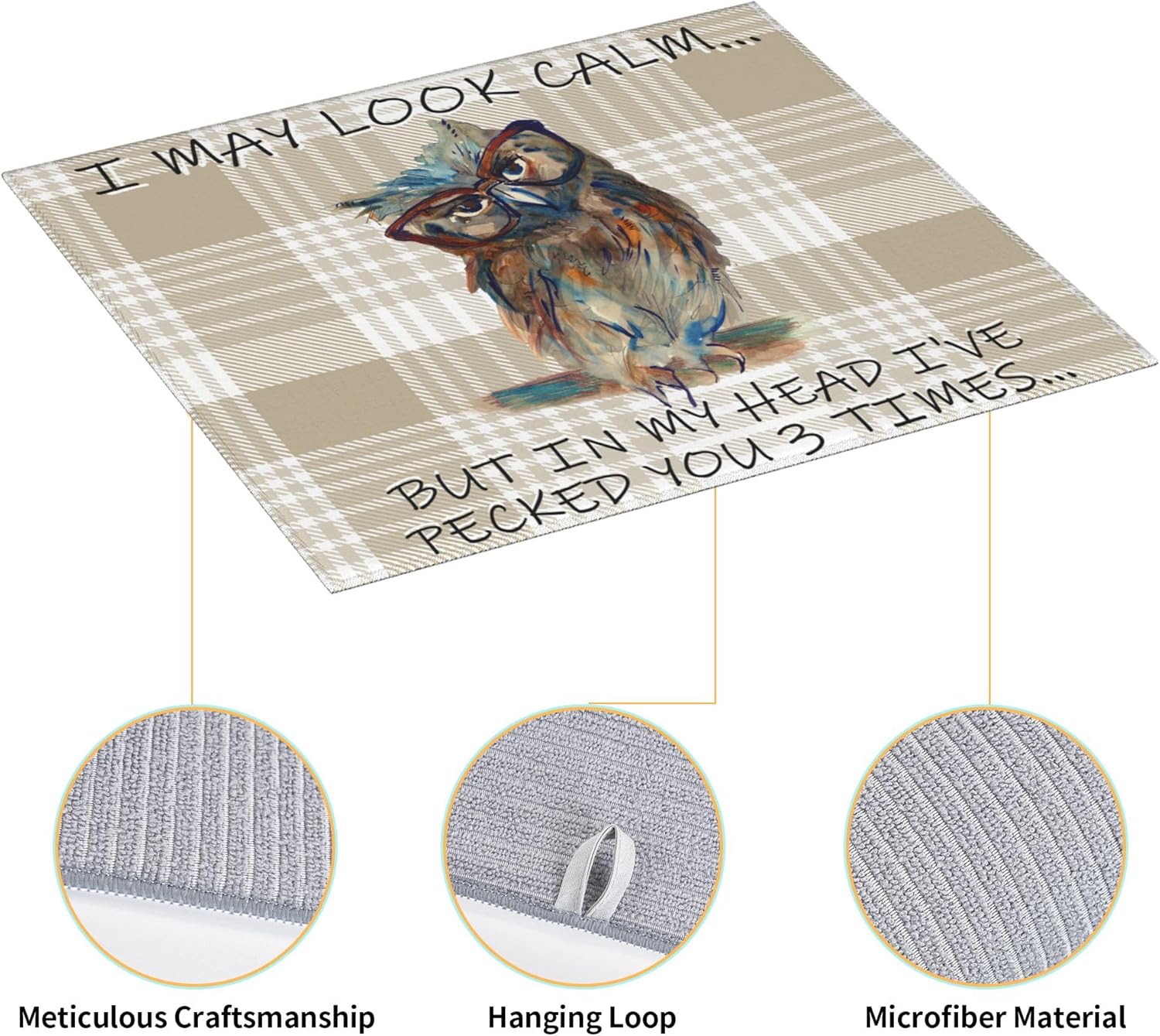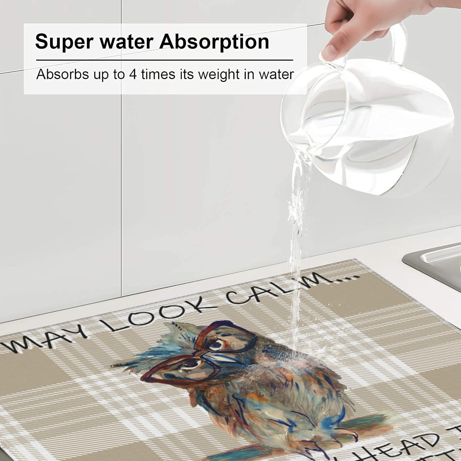 Funny Owl Dish Drying Mat for Kitchen Counter Cute Buffalo Plaid Drying Mat Washable Absorbent Reversible Microfiber Drying Pad Kitchen Accessories 16"x18"