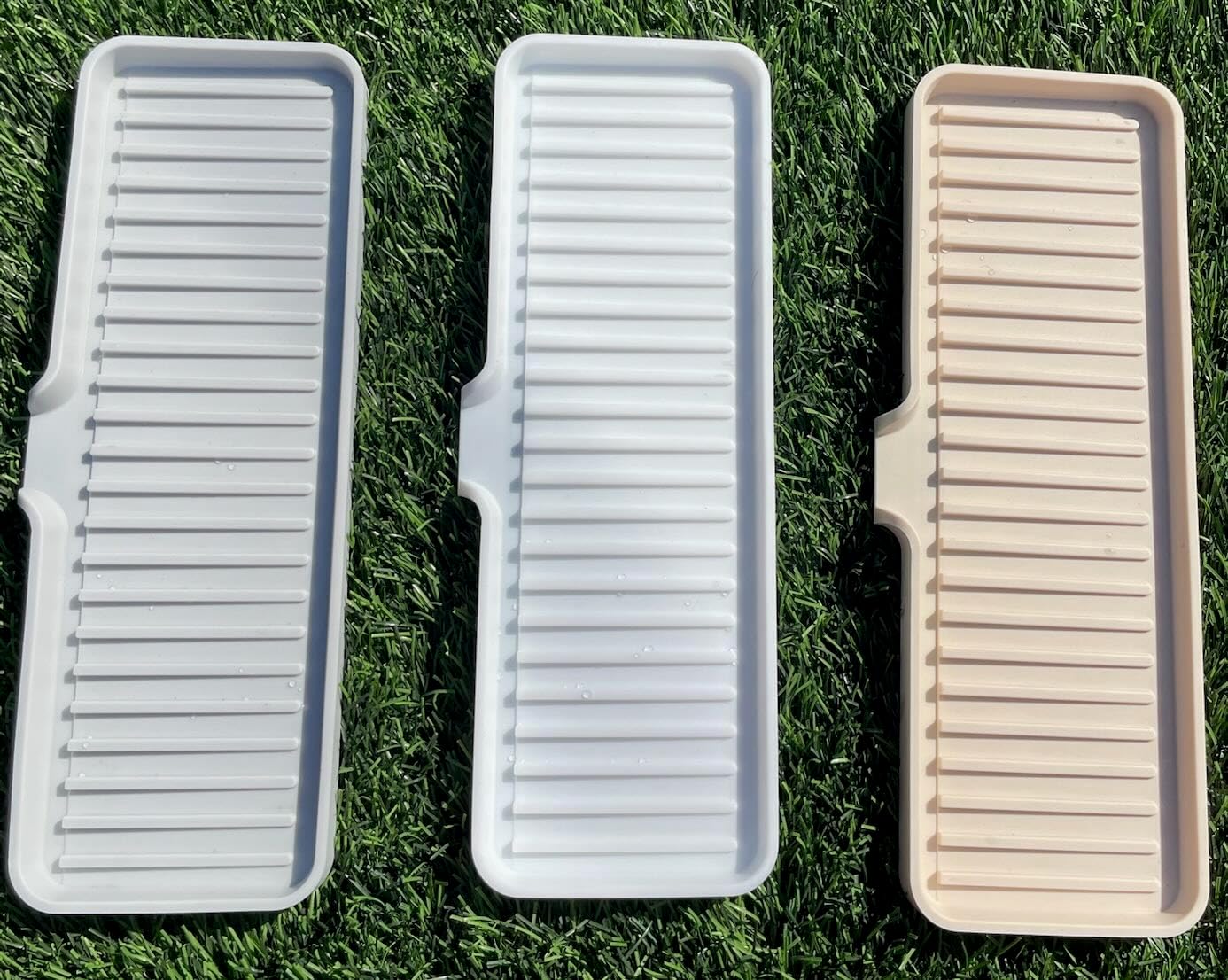 - A More Hygienic Home | A dedicated space for your dishwashing supplies, bathroom sink items, shower niche/shelf items. Tray and drain chute are slightly sloped to help funnel excess water away.Thick, sturdy base stays in place without suction while raised lines promote air flow, so items dry faster and are less prone to developing nasty odors.