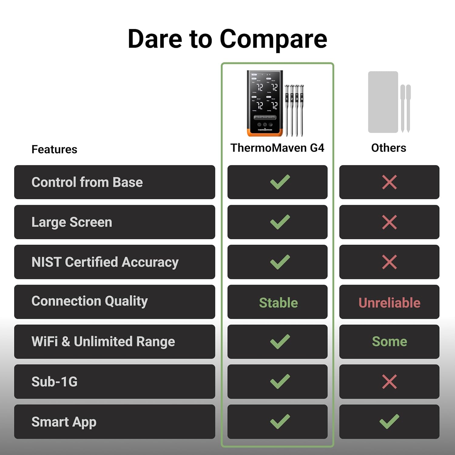 - 100% Wireless Freedom: Kiss tangled wires goodbye with the ThermoMaven G4. Roam freely with Bluetooth long-range connectivity, linking seamlessly from the base to the probes.