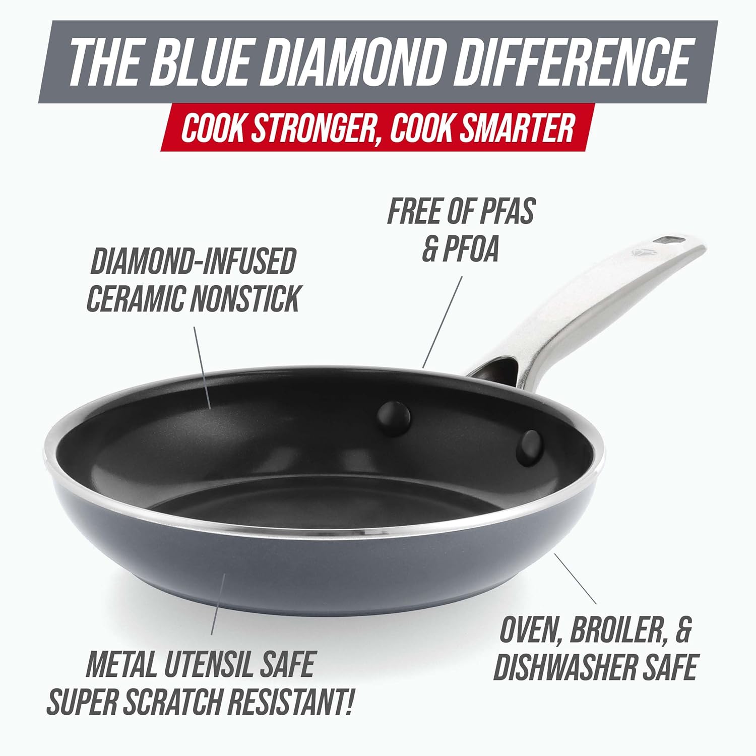 Blue Diamond 8" Nonstick Frying Pan Skillet, Diamond Infused PFAS & PTFE-Free Ceramic Pot, Dishwasher & Oven Safe, Stay Cool Handle, Durable Non Toxic Metal Utensil Safe, Egg & Omelet Pan, Gray