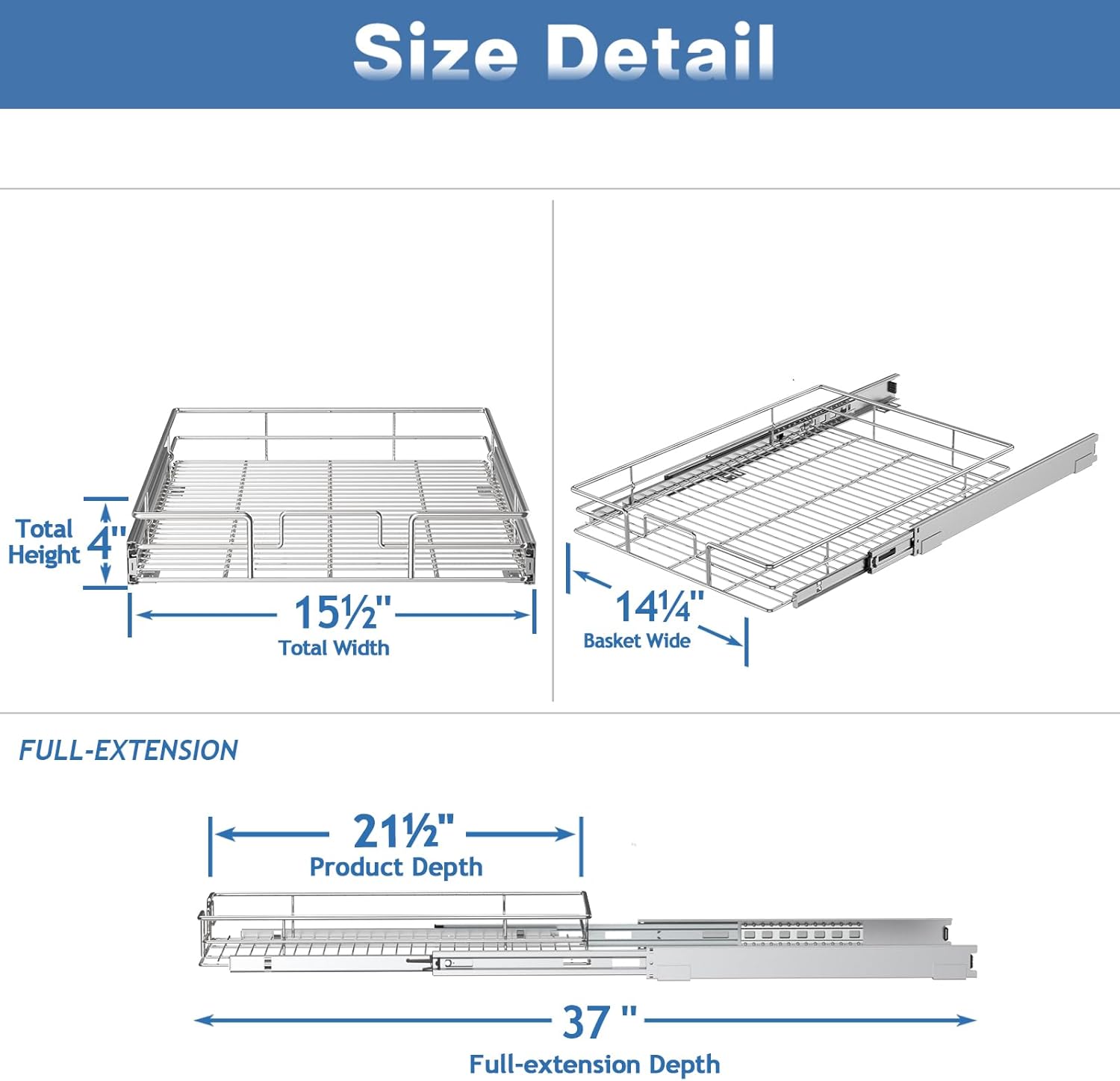 - 【Cabinet Pull Out Shelf Size】 This Kitchen organizer dimensions 15½"W x 21½"D x 4"H. Fits 16" cabinet openings and larger. ROOMTEC cabinet slide out shelves serves your needs for your kitchen, Bathroom, laundry and pantry storage organizing.