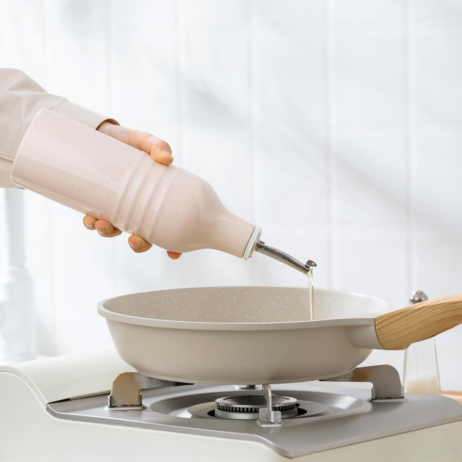 famiware Jupiter 16oz Ceramic Olive Oil Dispenser Bottle, 1 Piece Oil Dispenser for Kitchen with Stainless Steel Pourers, Suitable for Storage Vinegar, Soy Sauce, Coffee Syrup, Light Pink