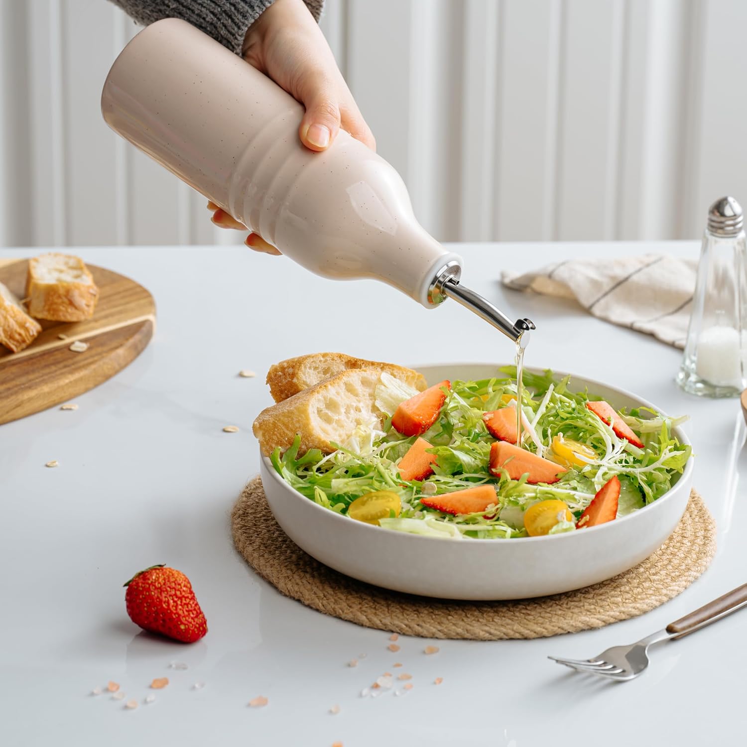 - KEEPS OIL FRESH - Exposure to light can cause olive oil to go rancid. This opaque olive oil dispenser bottle ceramic protects your olive oil or vinegar from harmful UV rays, keeping it fresh longer