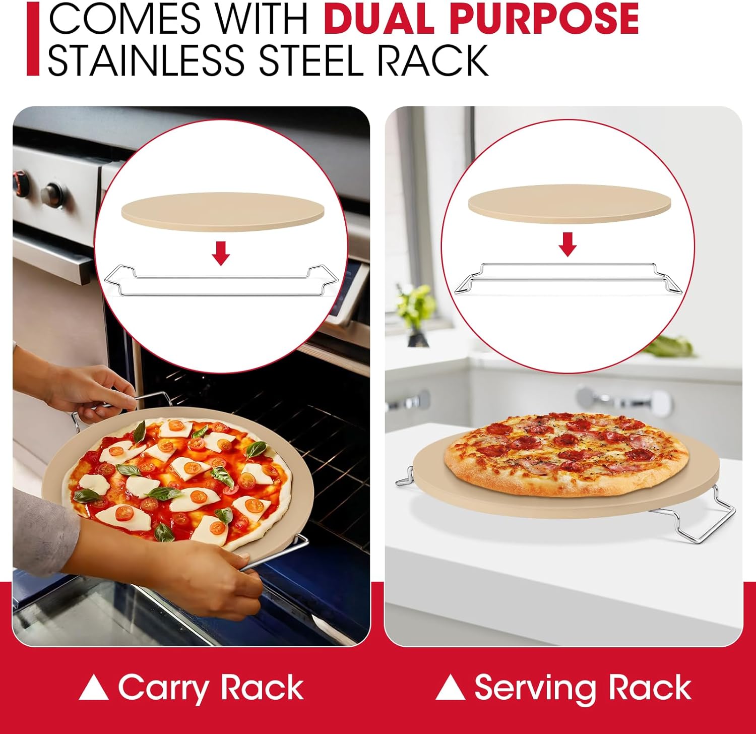 Unicook 12 Inch Round Pizza Stone for Oven and Grill, Cordierite Bread Baking Stone, Baking Crispy Pizzas, Bread and Cookies, Includes Carry Rack and Dough Scraper