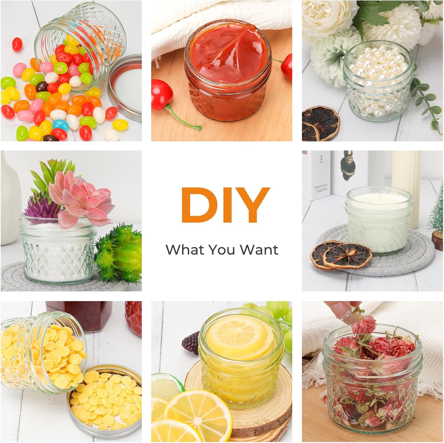 - Wide Range of Uses: The small canning jars can be refrigerated, frozen, drinks, fresh, suitable for storing all kinds of food. It can also be used as a vase, DIY into spices, herbs,candy,jelly,candles, and various decorations. Perfect for wedding favors, cupacke jars,candle jars even planter