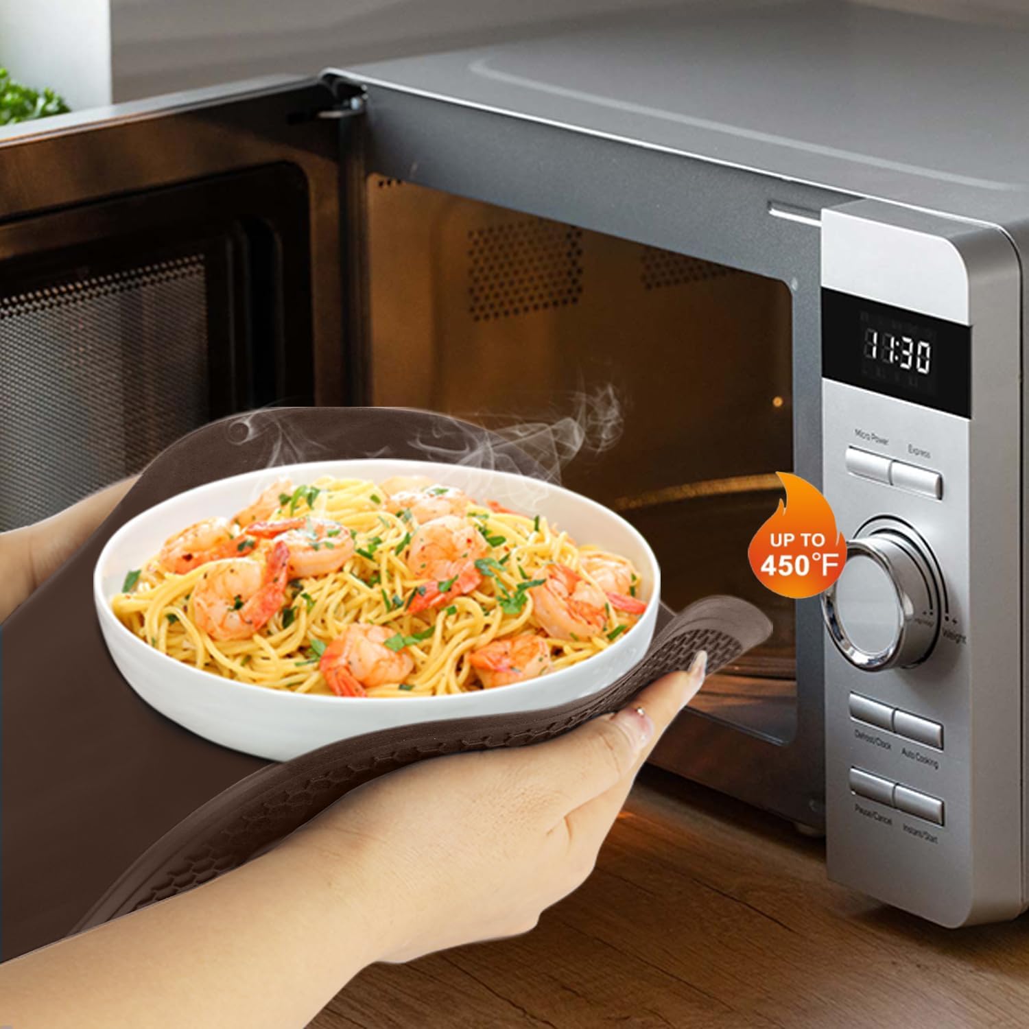 - š„ćBetter Circulationć: Our brown microwave mat has 2mm anti-slip Texture that helps dissipate heat faster. Features raised edge to help effortlessly lift hot bowls and plates while protecting from heat. These silicone trivet mats are heat protection and insulated as a protector for countertops. Heat-resistant temperature from -40°F-446°F(-40°C to 230°C), safe for use in the oven, freezer, microwave, and as a pot holder, trivet, jar opener, spoon rest or anywhere you need extra grip or extreme heat.