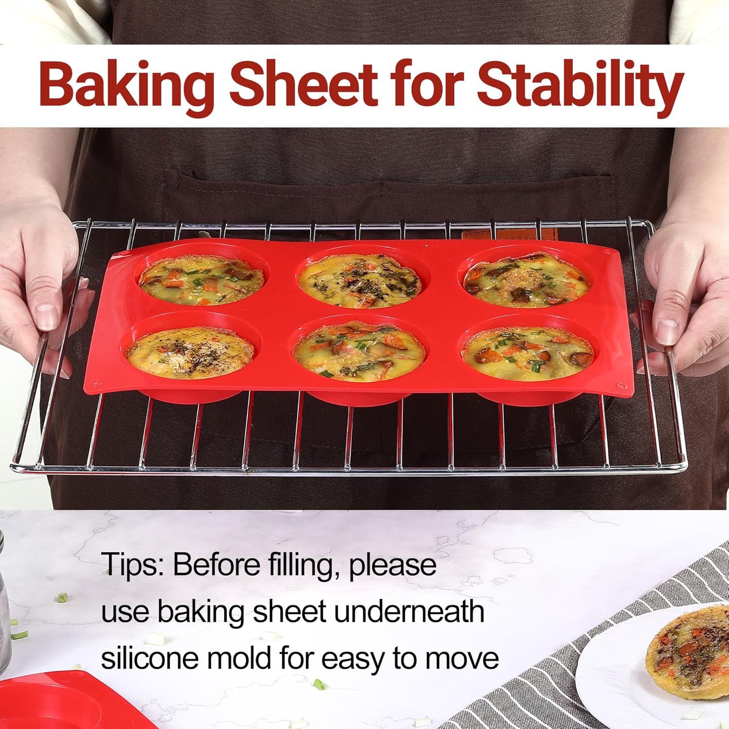 - Tips: Due to made out of silicone, it's flexible, please make sure to put silicone baking pan on a cookie sheet for support before filling in
