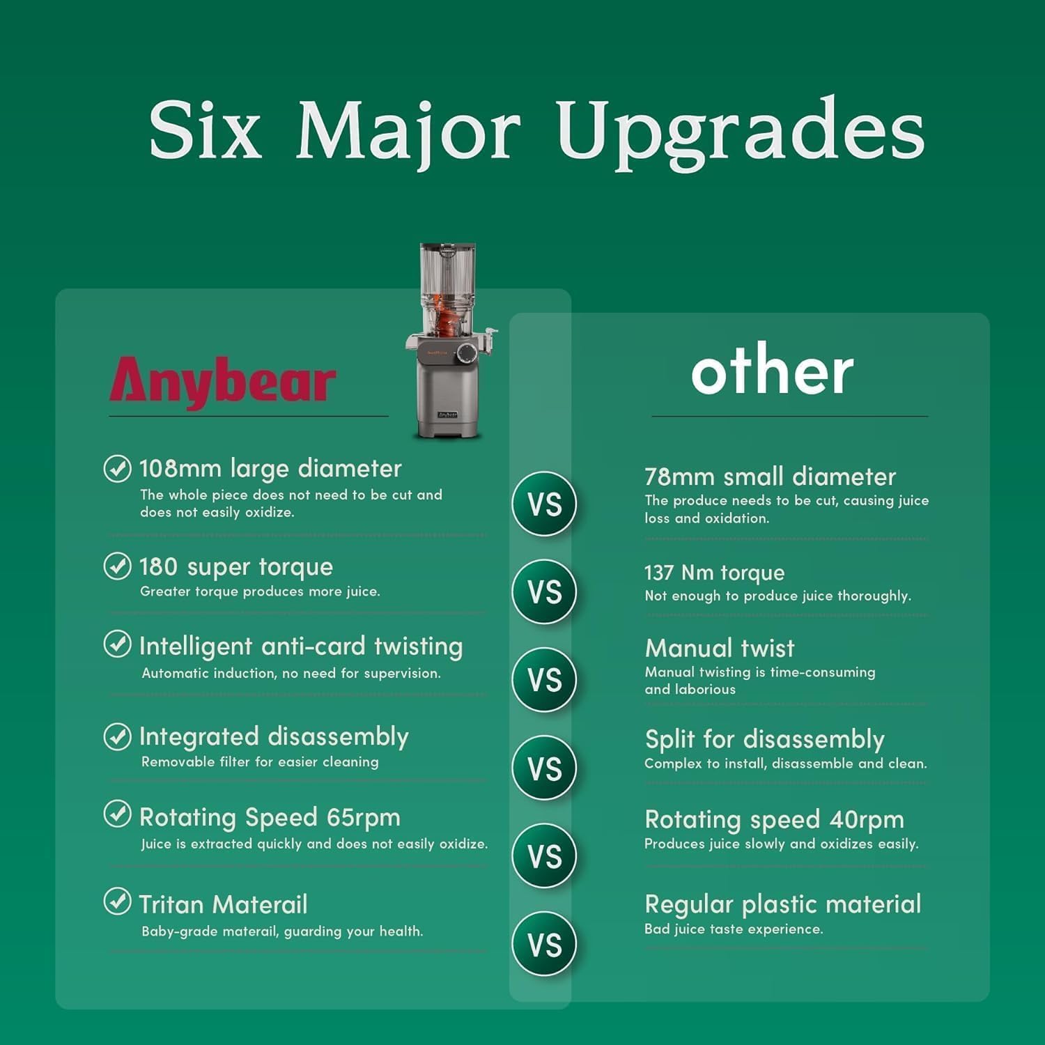 - ă180nm HIGH-TORQUE, 200W Powerful Motoră Anybear masticating juicer machine with a high torque of 180nm, ensuring the rotating speed up to 65 RPM, paired with a powerful 200W motor, effortlessly extract juice at low speeds to enhance juice yield up to 98.9%. Minimize oxidation for doubled flavor and freshness.