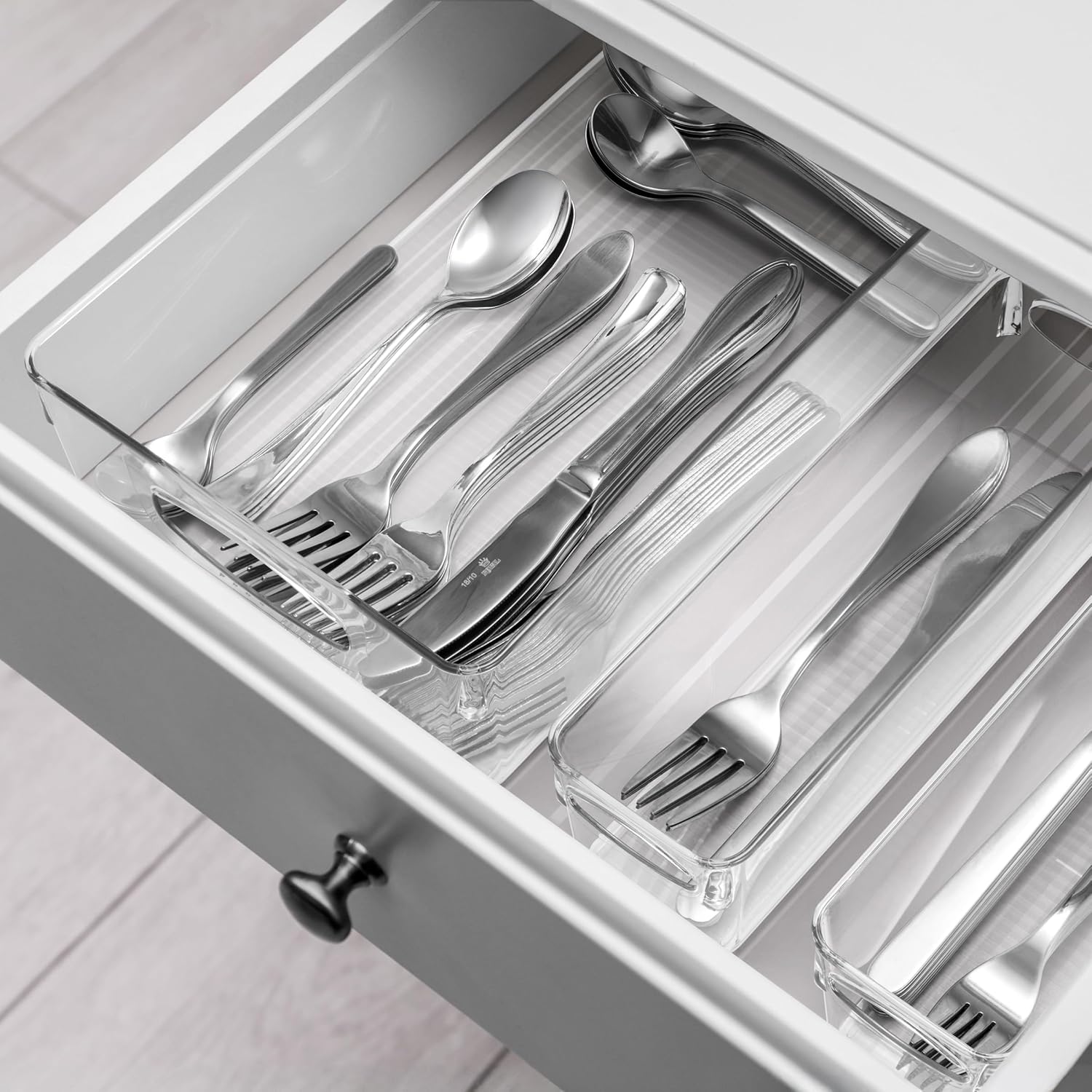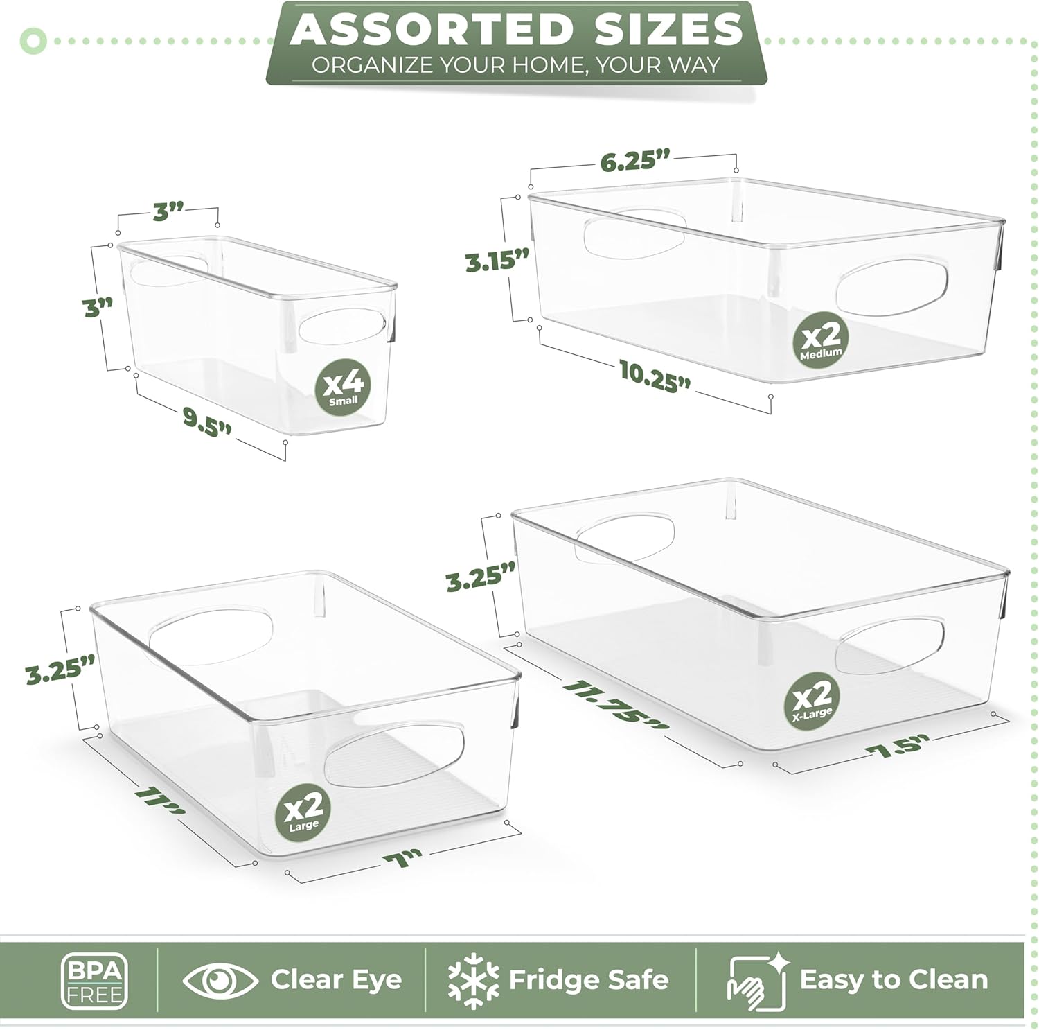 - Set Includes and Dimensions: This set includes 10 clear plastic storage bins in a variety of sizes: 4 Small (9.5 x 3 x 3 inches) for compact storage, 2 Medium (10.25 x 6.25 x 3.15 inches) for mid-sized items, 2 Large (11 x 7 x 3.25 inches) for larger essentials, and 2 X-Large (11.75 x 7.5 x 3.25 inches) for maximum storage needs
