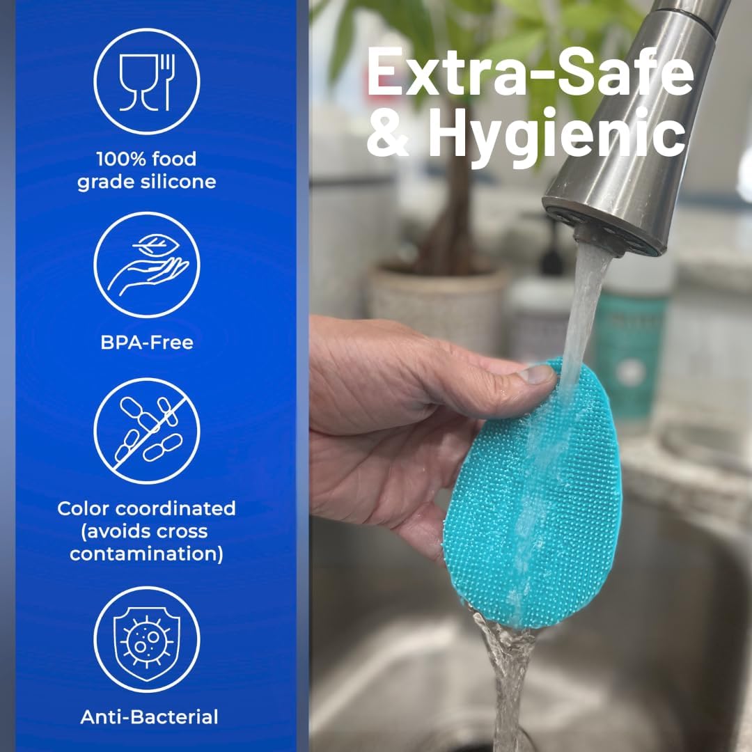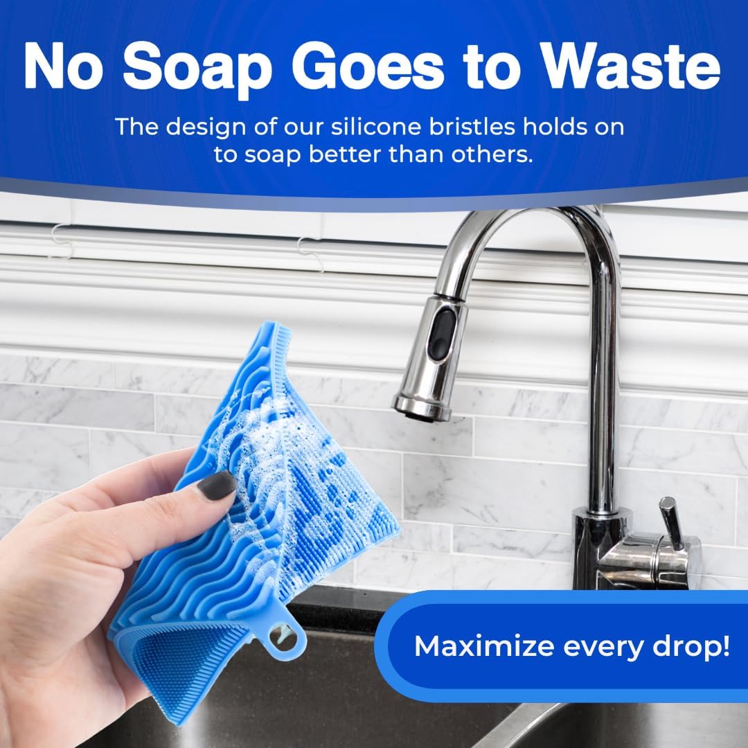 - Unlike other silicone dish scrubber designs that don't hold on to soap - so you have to keep adding more - our silicone sponges for dishes works efficiently with your favorite soaps and degreasers, so you can use less cleaning fluids. In fact, this kitchen scrubber is designed to make cleaning more efficient all around