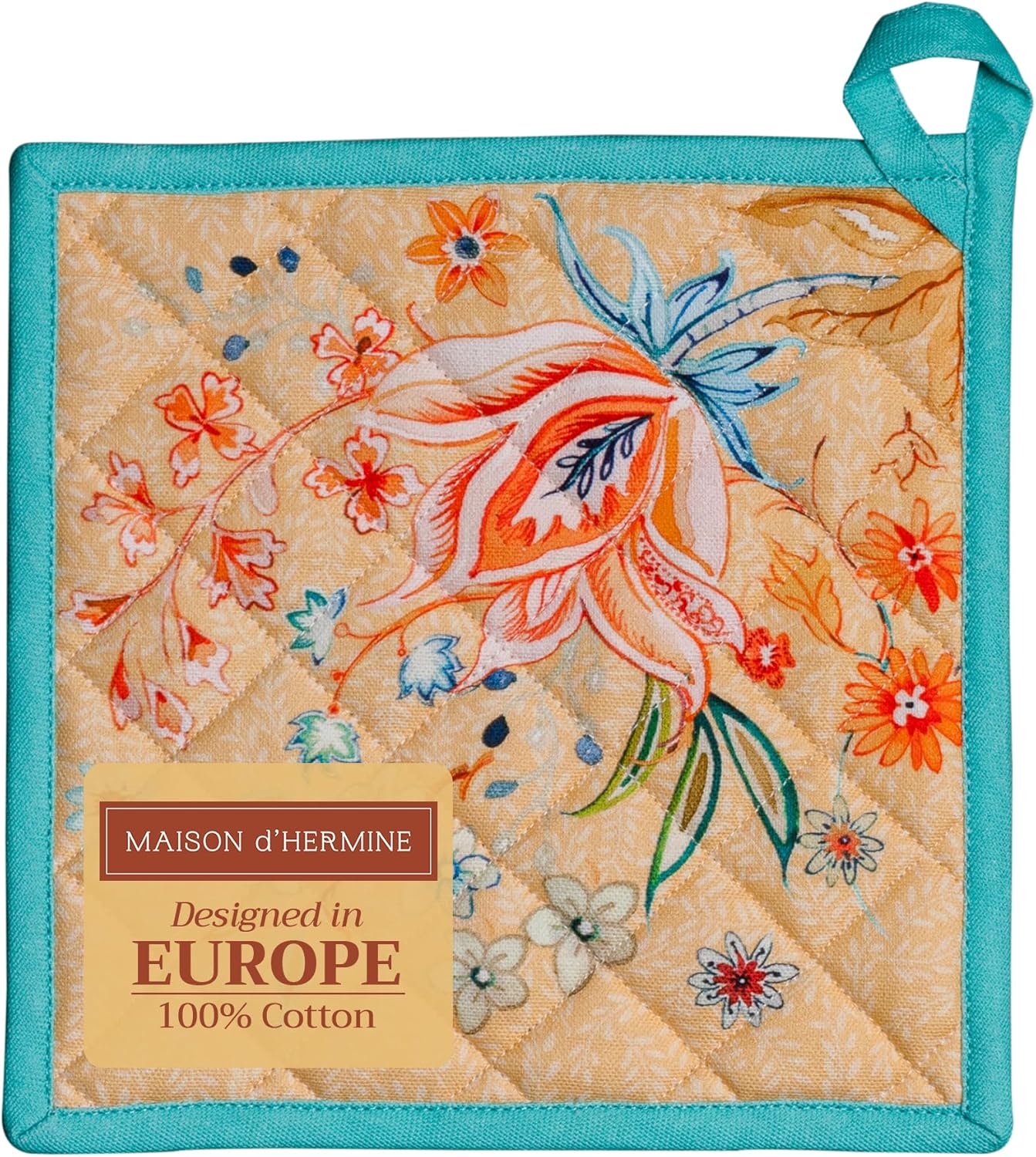 - Package includes: 1 pot holder measures 8"x8". Ideal as a hot pad for dishes, coffee pots, cast iron pans, or cookware. Designed in Europe and Made in India, it blends style, function, and comfort into a daily kitchen essential