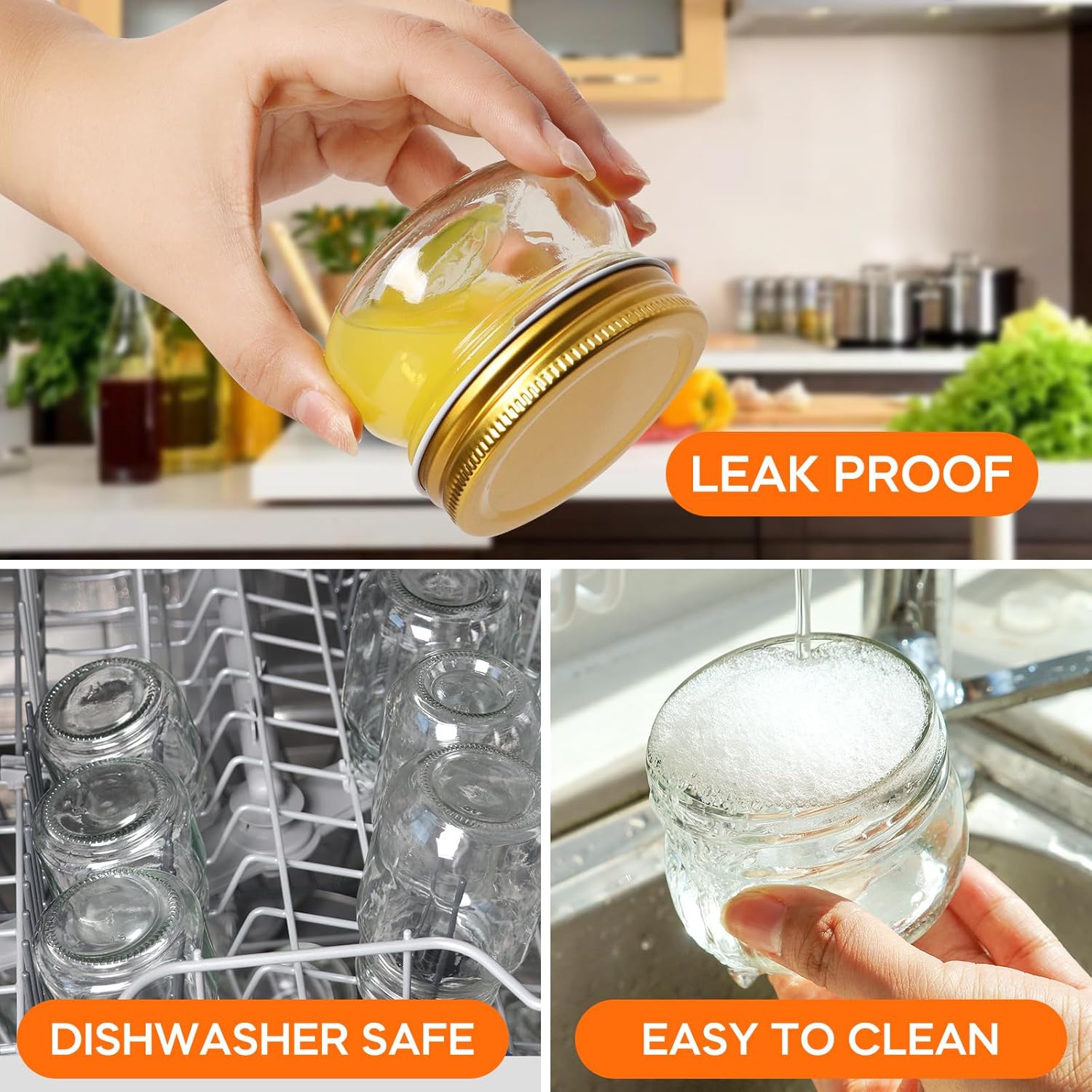 - PREMIUM MATERIAL & DURABILITY:Crafted from thick, high-quality glass , 4oz Mason Jars reinforced for long-lasting use and lead-free, making it safe for storing food items. They are safe for microwave heating and dishwasher cleaning (without the lid), ensuring convenience in daily use