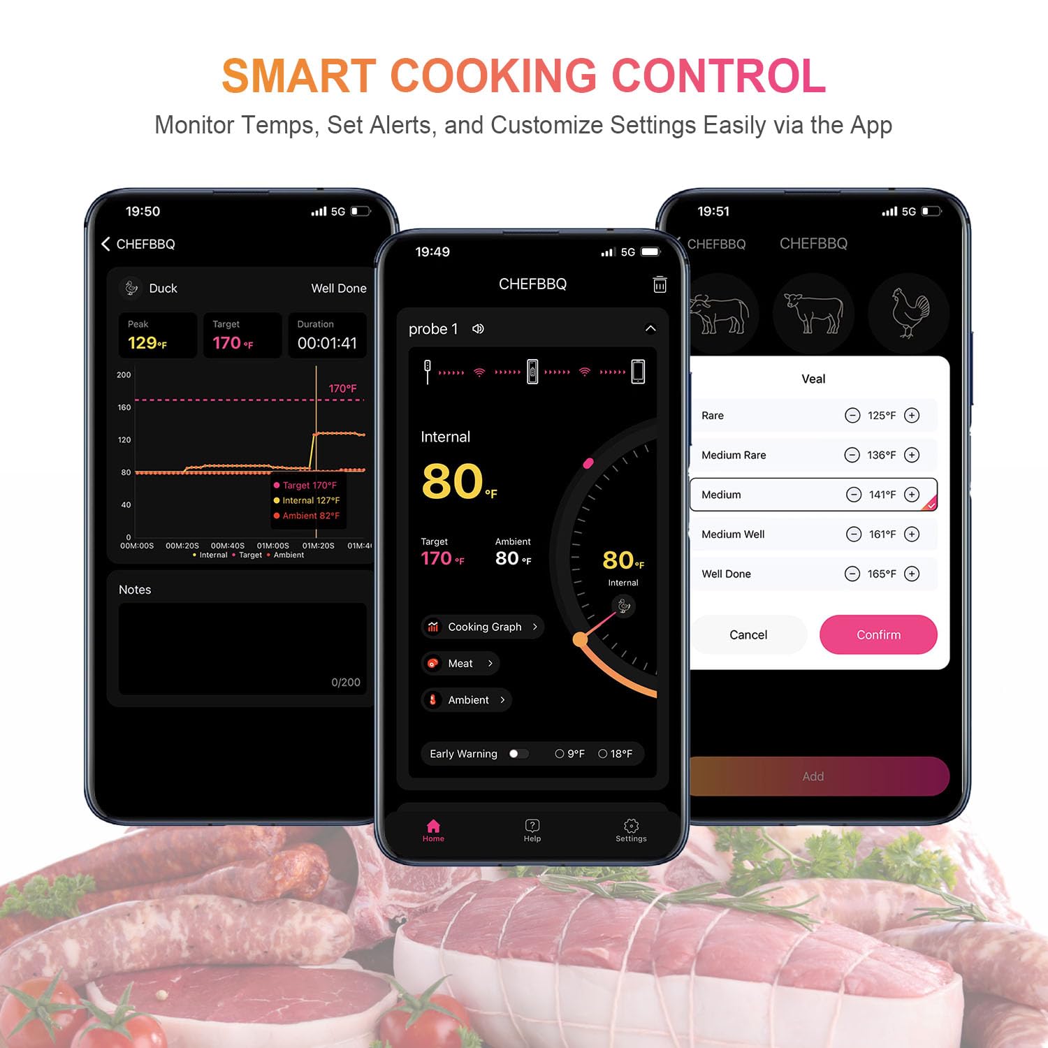 - Smart App with One-Touch Settings: The app syncs with the main unit in real time and offers preset temperature suggestions for different meats and doneness levels. Its user-friendly interface with graphical views makes it simple to adjust settings with just one click
