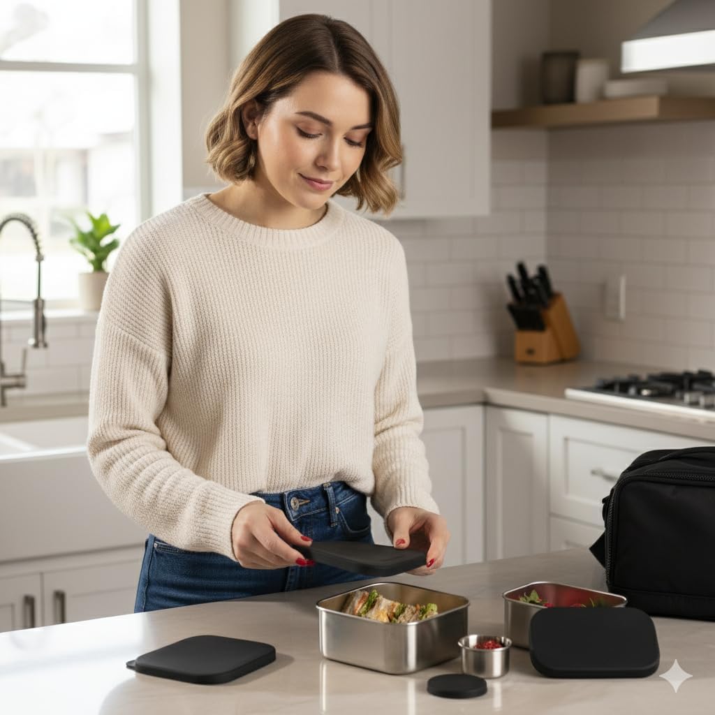 - FITS EVERY NEED -PINICS, COLLEGE, OFFICE, WORLK, OUTDOOR - Perfect flexibility and serve as Stainless Steel Lunch Snack Containers | Leak Proof Stainless Steel Food Containers with Silicone Lids - Perfect Metal Food Containers with Lids . This Stainless steel bento box is designed in simple contours/ elegant colors for ages 12+