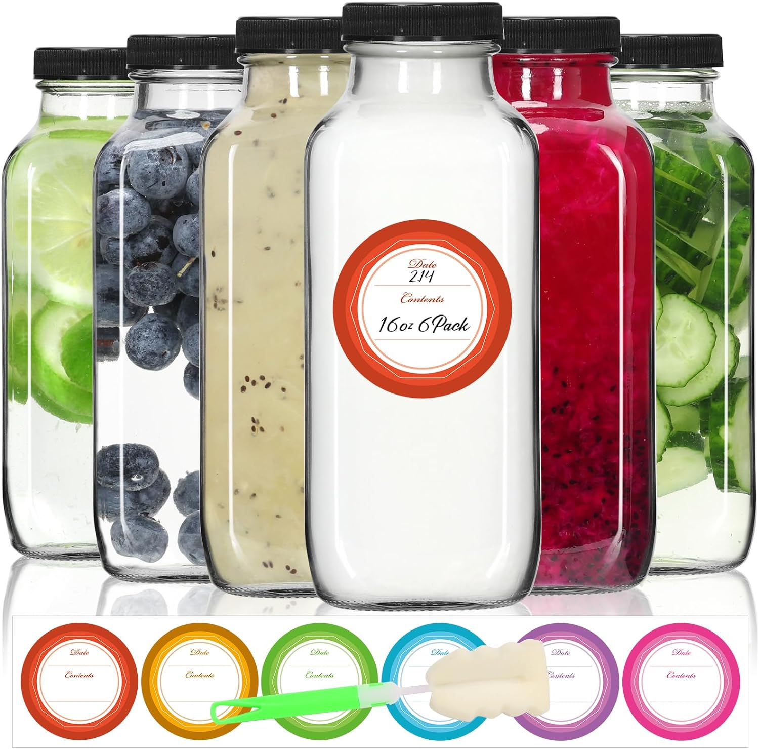 - Complete Set: 6 pack 16 oz square glass bottles with reusable BPA-free plastic lids; includes 1 soft sponge brush for scratch-free cleaning; 6 color-coded labels for quick content; secured with shock-absorbing foam packaging for safe delivery