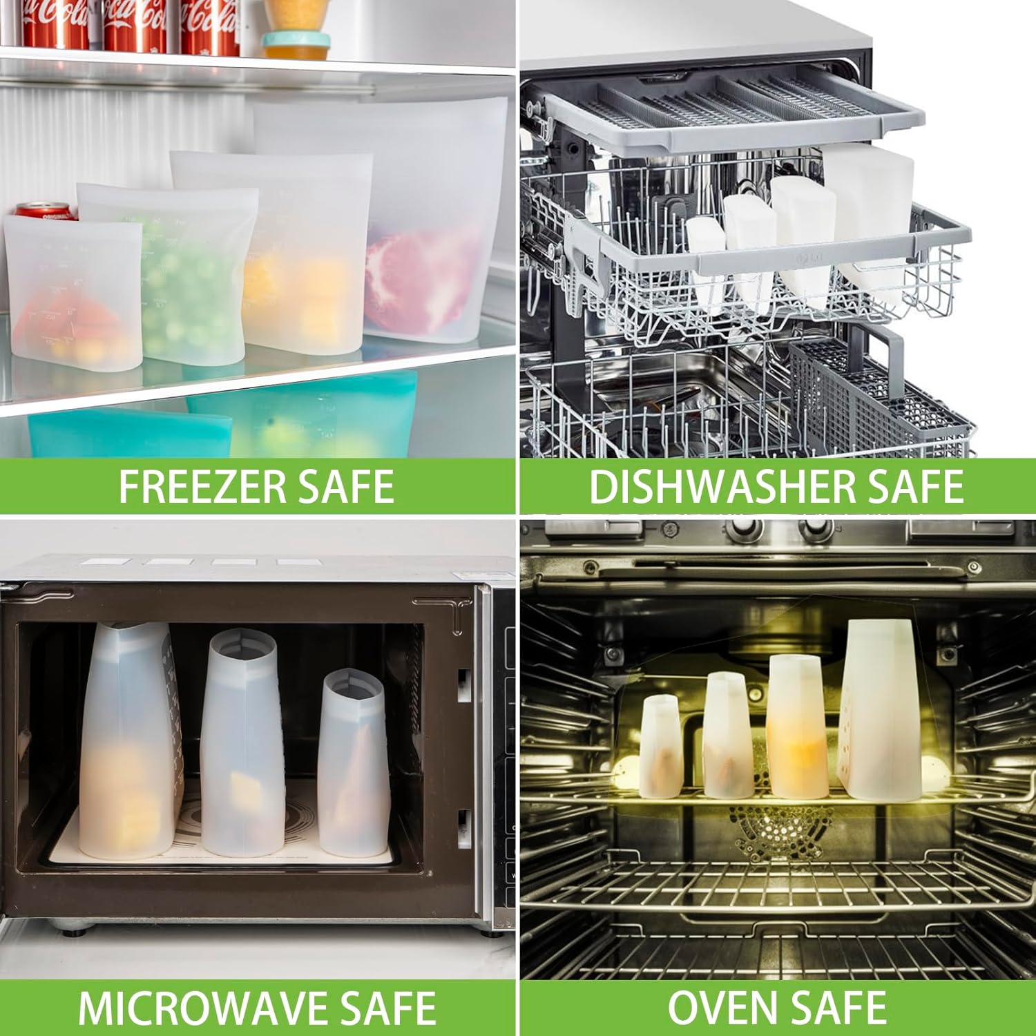 - ăDISHWASHER FREEZER MICROWAVE OVEN SAFEăTired of plastic bags? (PEVA is still plastic.) Switch to silicone food bags for safer leftover storage. These reusable, non-toxic bags are safe for the Microwave, Freezer, Oven, and Dishwasher, withstanding up to 428â temperatures, ideal for all your needs. Note: The 3000ml Extra Large bag is quite tall and cannot stand upright in a standard microwave. For microwave use, please lay it flat or fold it to fit