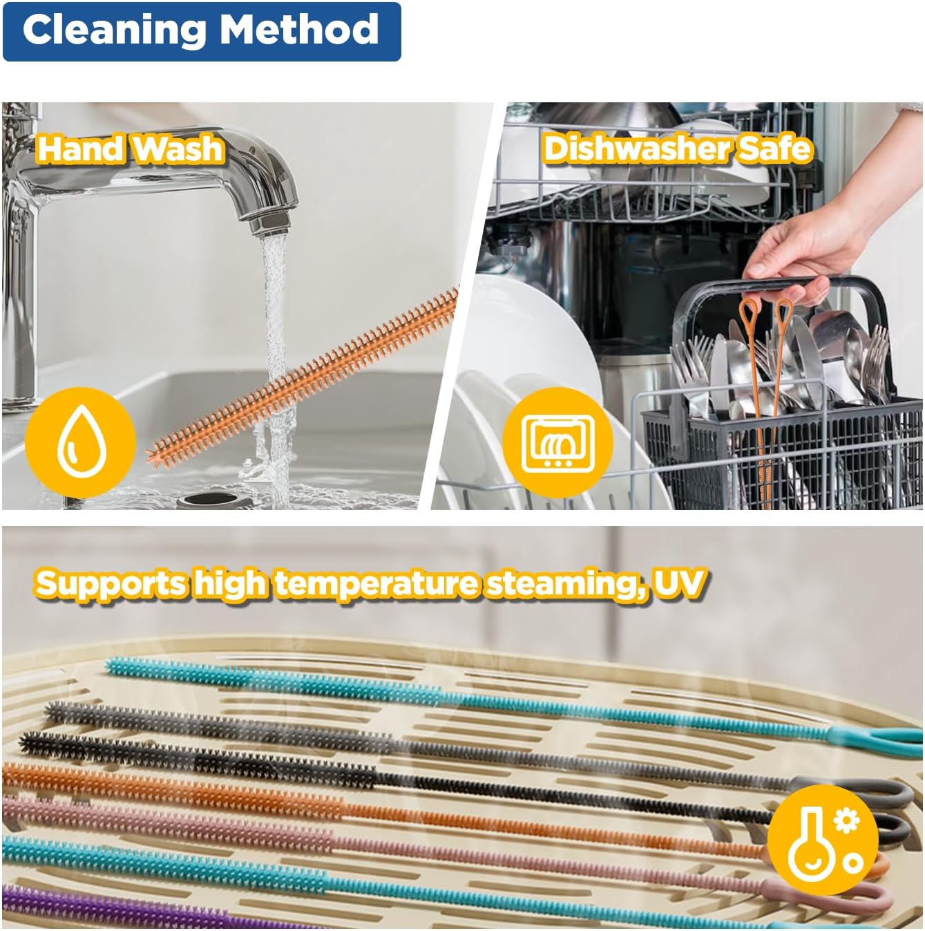 - >Easy to Clean and Dry: Our straw brushes is wrapped in silicone so you can wash it in the dishwasher or rinse it with water, due to the hydrophobic nature of silicone, it can be gently tumbled dry to keep it clean and hygienic, and there is a hanging hole on the end so you can hang it to dry as well.