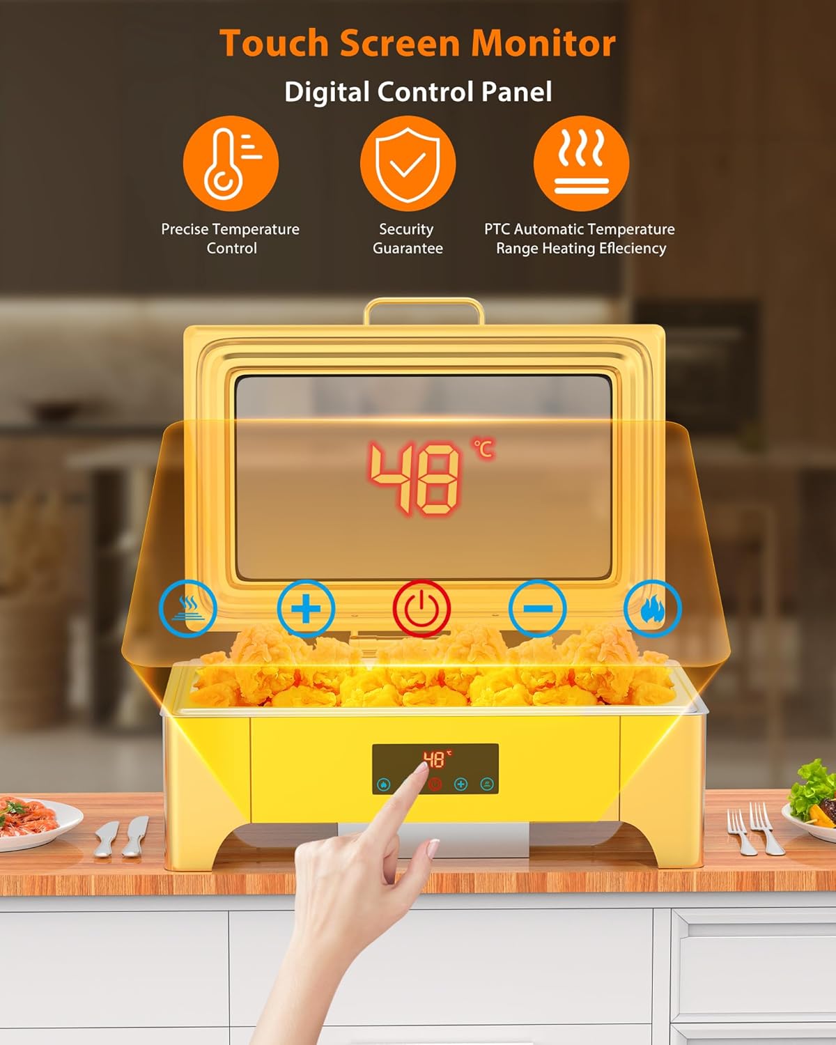 - 【Touch Screen】 The newly upgraded chafing dish is with intelligent touch screen which has all the functions of previous generation buffet stove, but has added an infared sensor.