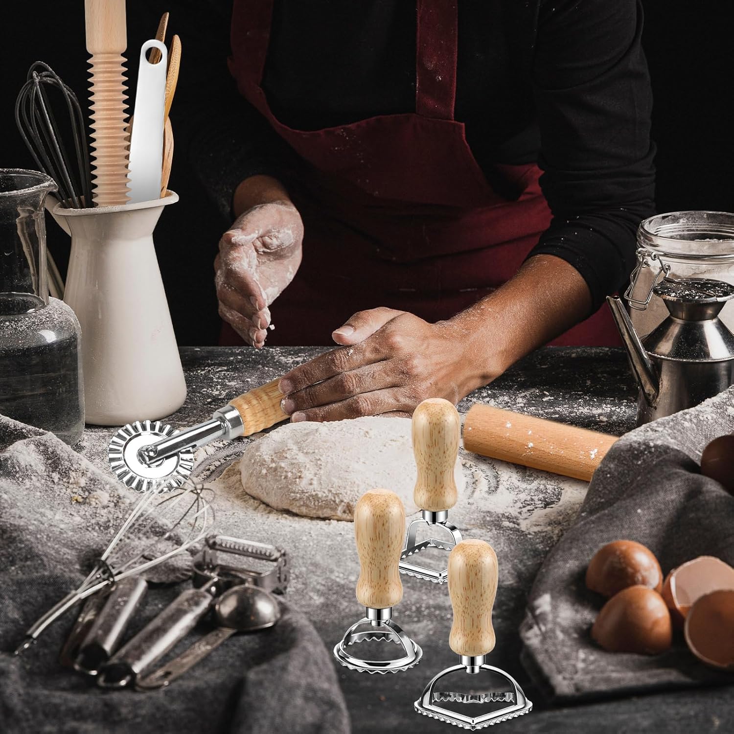 - Versatile and Multi-Purpose: This pasta-making kit includes 11 tools: a dumpling maker, a dough scraper, a stuffing spoon, a dumpling wrapper mold, a rolling pin, a gnocchi board, a wooden noodle cutter with a roller, and four dumpling stamp cutters. Designed to meet diverse needs, itβs perfect for making pasta, dumplings, cookies, and more, making various handmade noodles effortlessly.