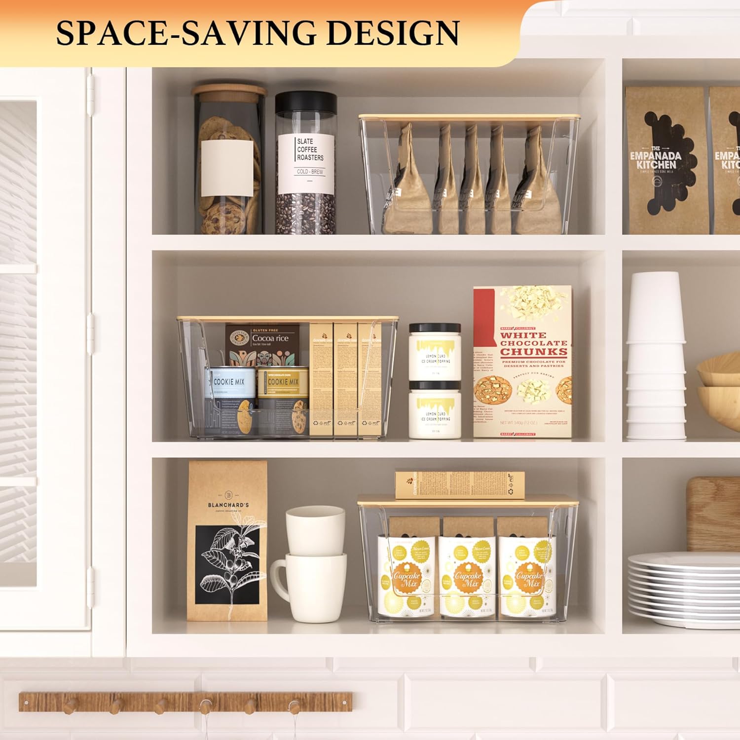 - Versatile Storage: These clear plastic bins with bamboo lids provide a stylish and functional storage solution for pantry, bathroom, kitchen, closet, cabinet, and fridge organization. Maximize your space while keeping your essentials neatly arranged and easily accessible