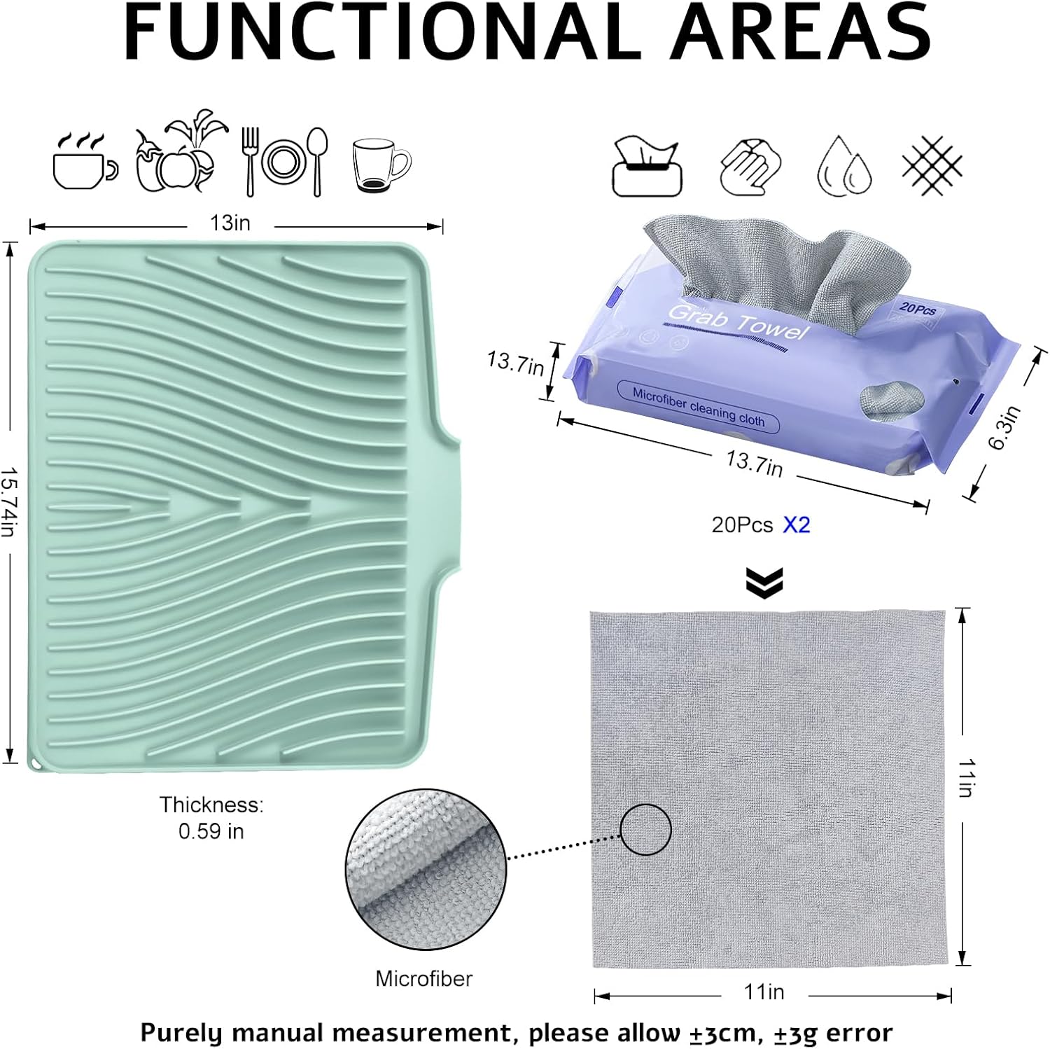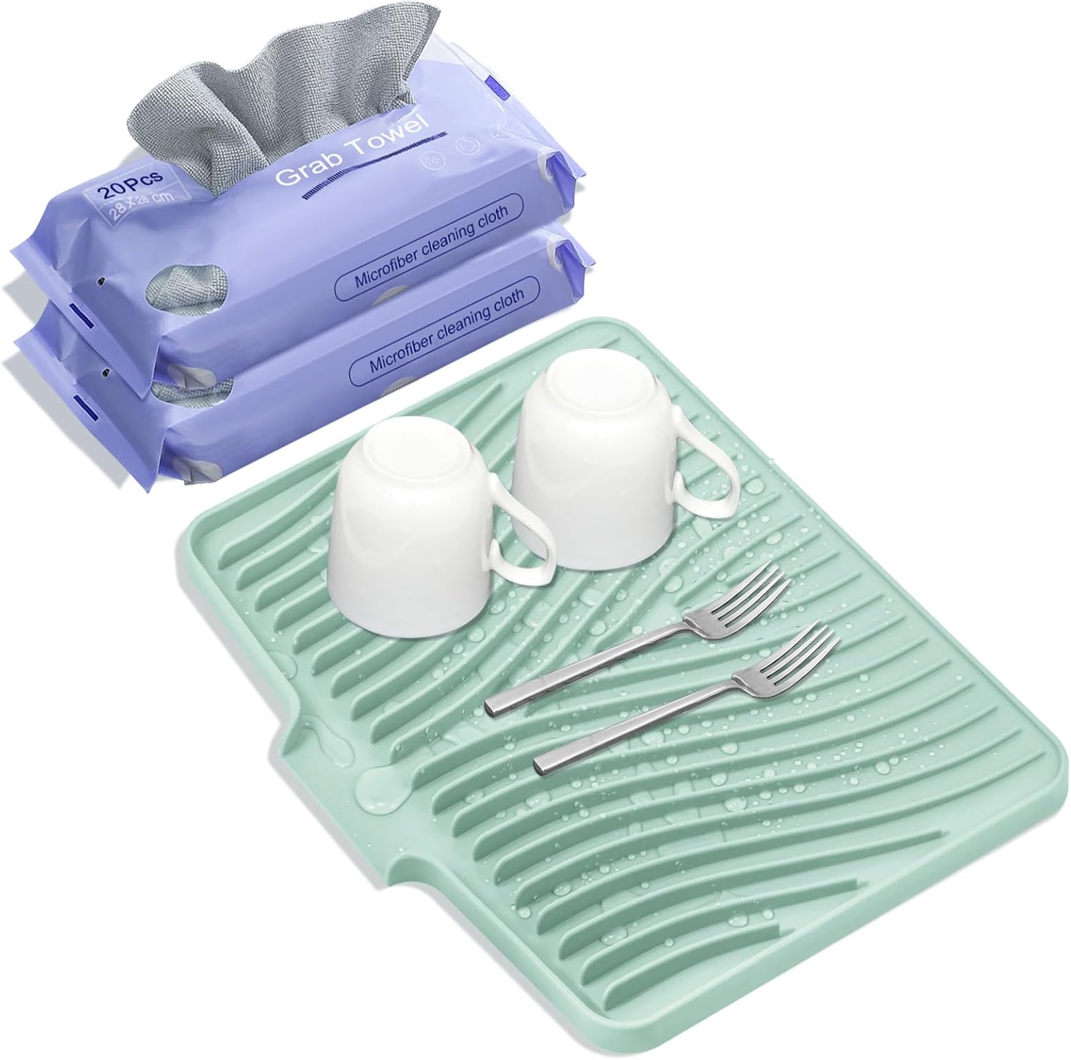 Silicone Dish Drying Mat, Stone Drying Mat for Kitchen Counter with Built-in Drain, Non-Slip 15.8" X 13" Drying Matt Kitchen Counter and Grey Microfiber Cleaning Cloth, Cleaning Rags Set(Mint)