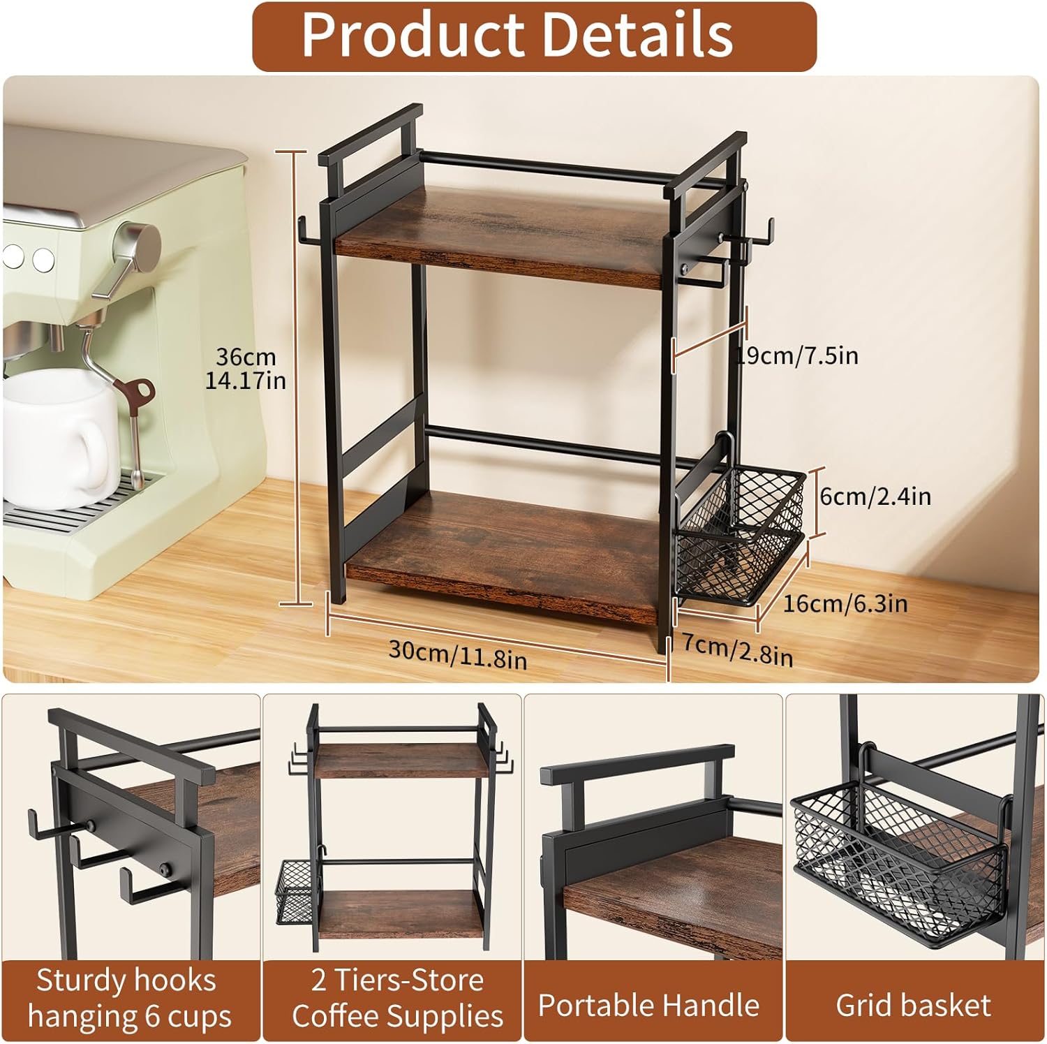 - Convenient Organization: This 2-tier wooden counter shelf neatly organizes your coffee bar essentials like mugs, cups, syrups, and creamers.