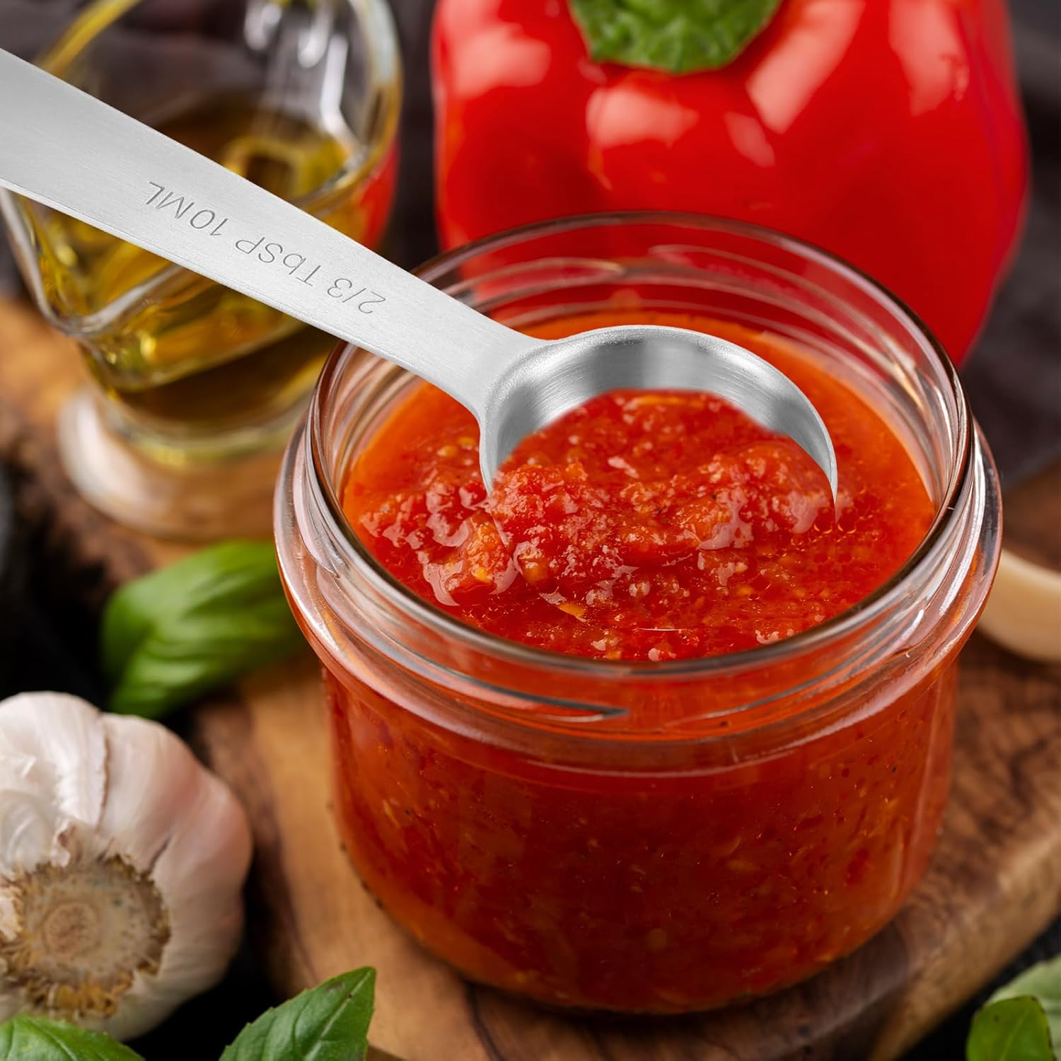- 【Thoughtful design】Our 2/3 tsp measuring spoon is thoughtfully designed, combining the essence of the cup-shaped round head design and the long handle design. This allows the small measuring spoons to easily penetrate into spice jars and other small containers, effectively overcoming the problem of spice spillage and spoon storage, bringing you an unprecedented convenient experience