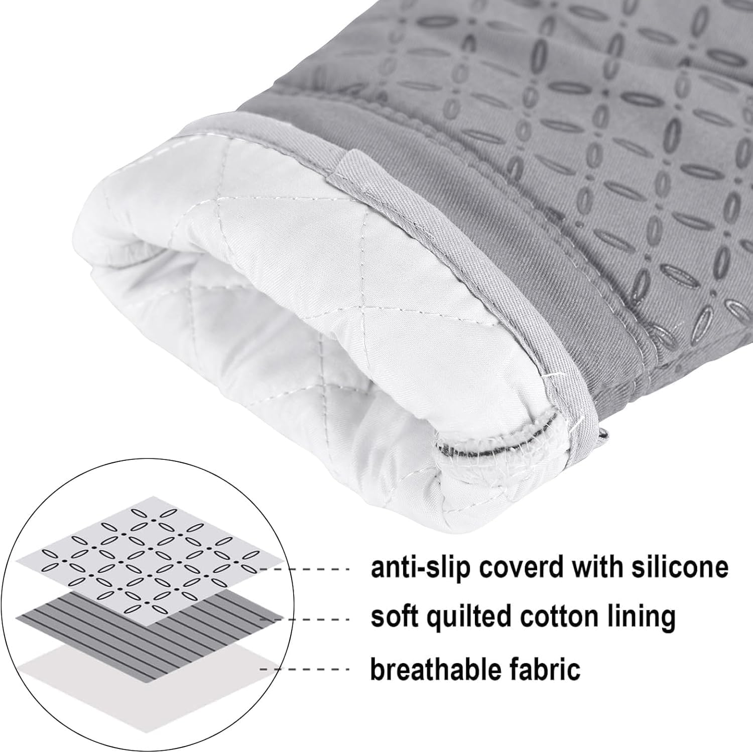 - 500°F HEAT RESISTANT &NON-SLIP: This oven mitts heat resistant 500 degrees because of the durable construction so it can effectively keep you protected from burning while you enjoy cooking and grilling. Enhanced with anti-slip silicone design to provide a more robust, non-slip grip that can be held securely when handling the kitchen utensils