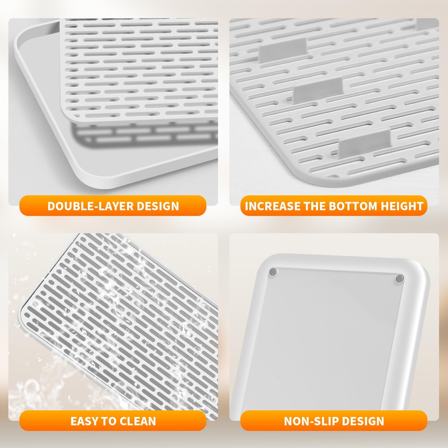 - DOUBLE-LAYER DESIGN: The drying pad features a non-slip surface to keep dishes and glassware secure. The top grid plate allows for rapid drying of glasses, mugs, and utensils, while the lower water-collecting tray channels excess water to the bottom, ensuring both drainage and storage in one convenient design.