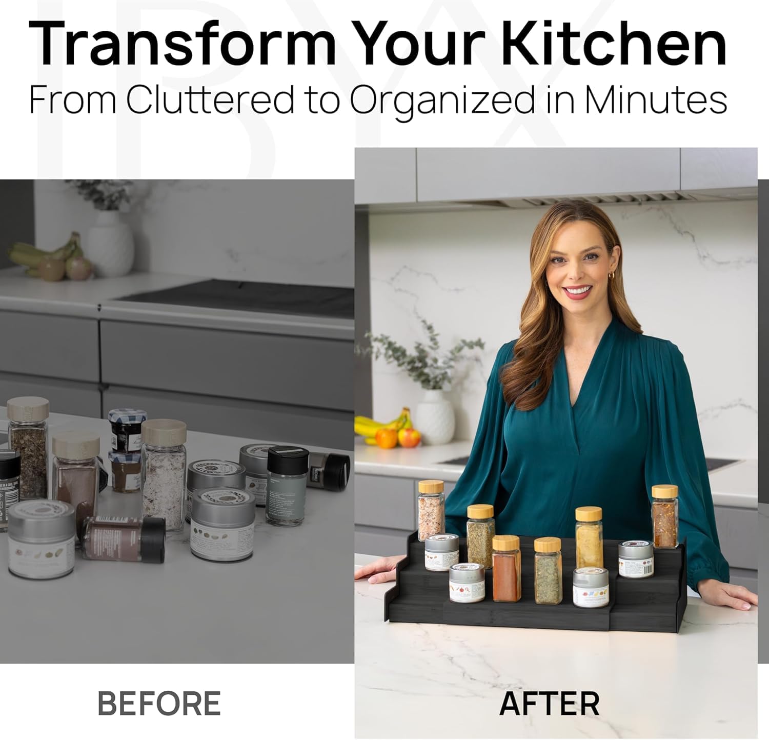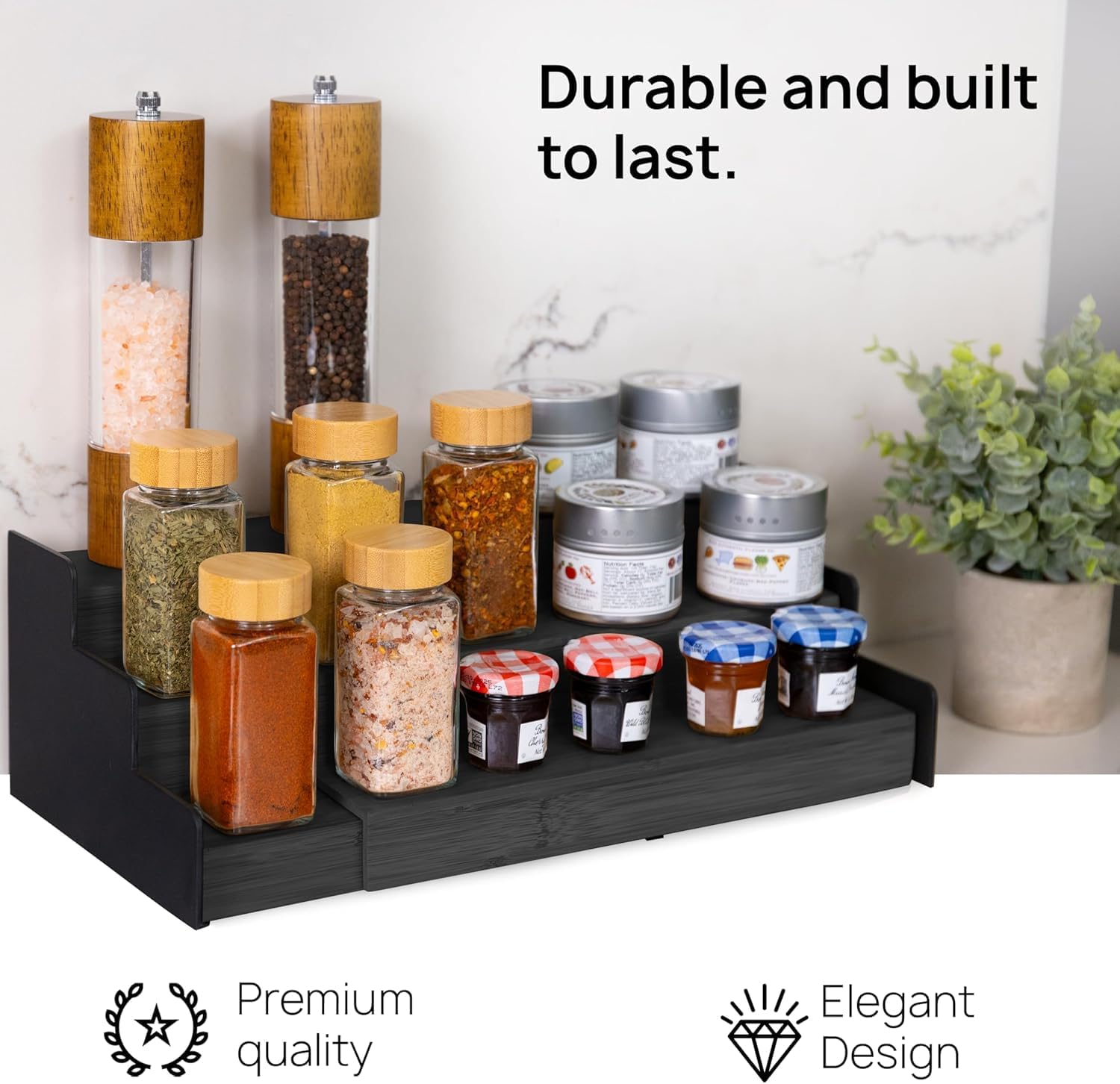 Ibyx Premium 3-Tier Spice Rack Organizer for Cabinet - Expandable Bamboo Spice Storage - Non-Skid Countertop Step Spice Shelf - Great for Kitchen Cabinet, Countertop, Cupboard, Pantry (Black)