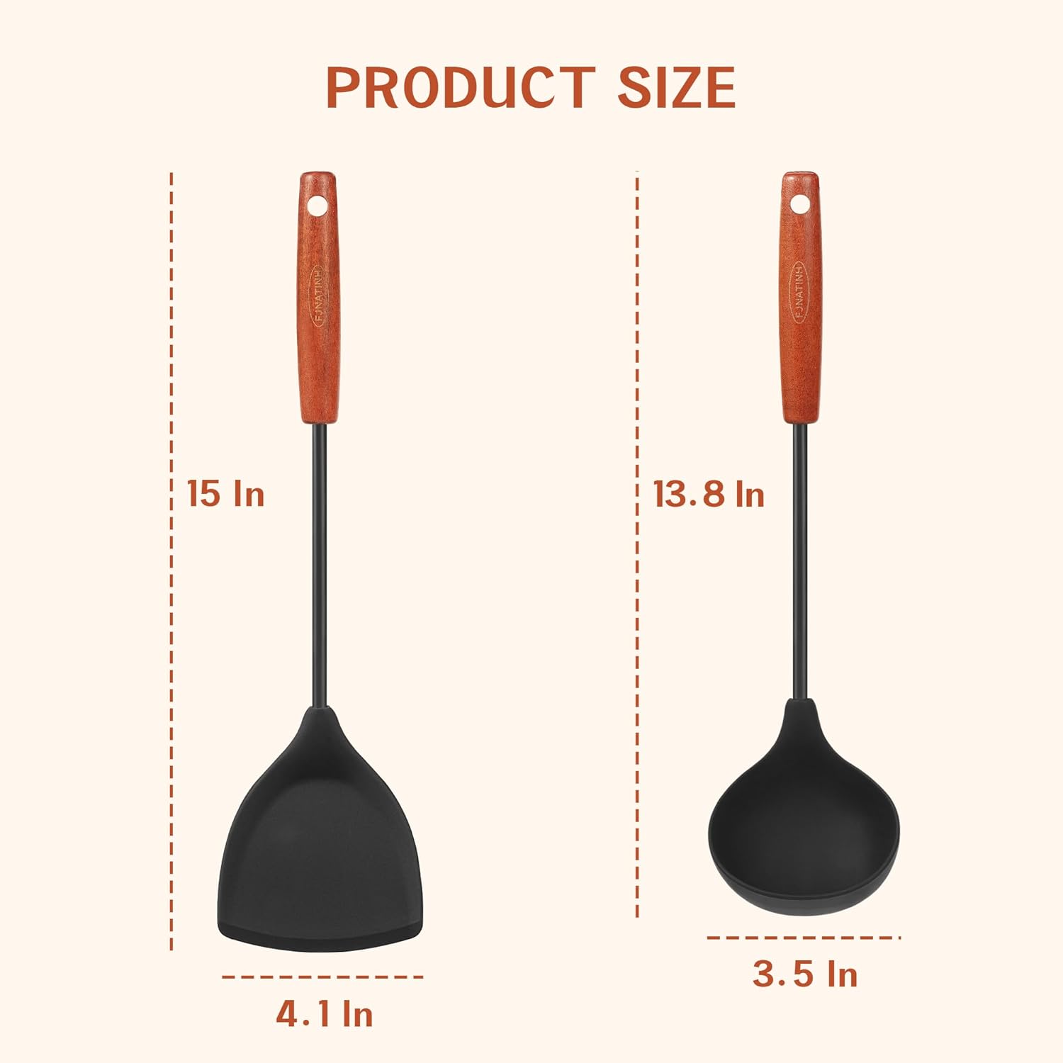 FJNATINH Silicone Wok Spatula and Ladle Tool Set,Non Stick Heat-Resistant Stainless Steel Cooking Utensils BPA Free Kitchen Utensils Cookware, Pack of 2,Black