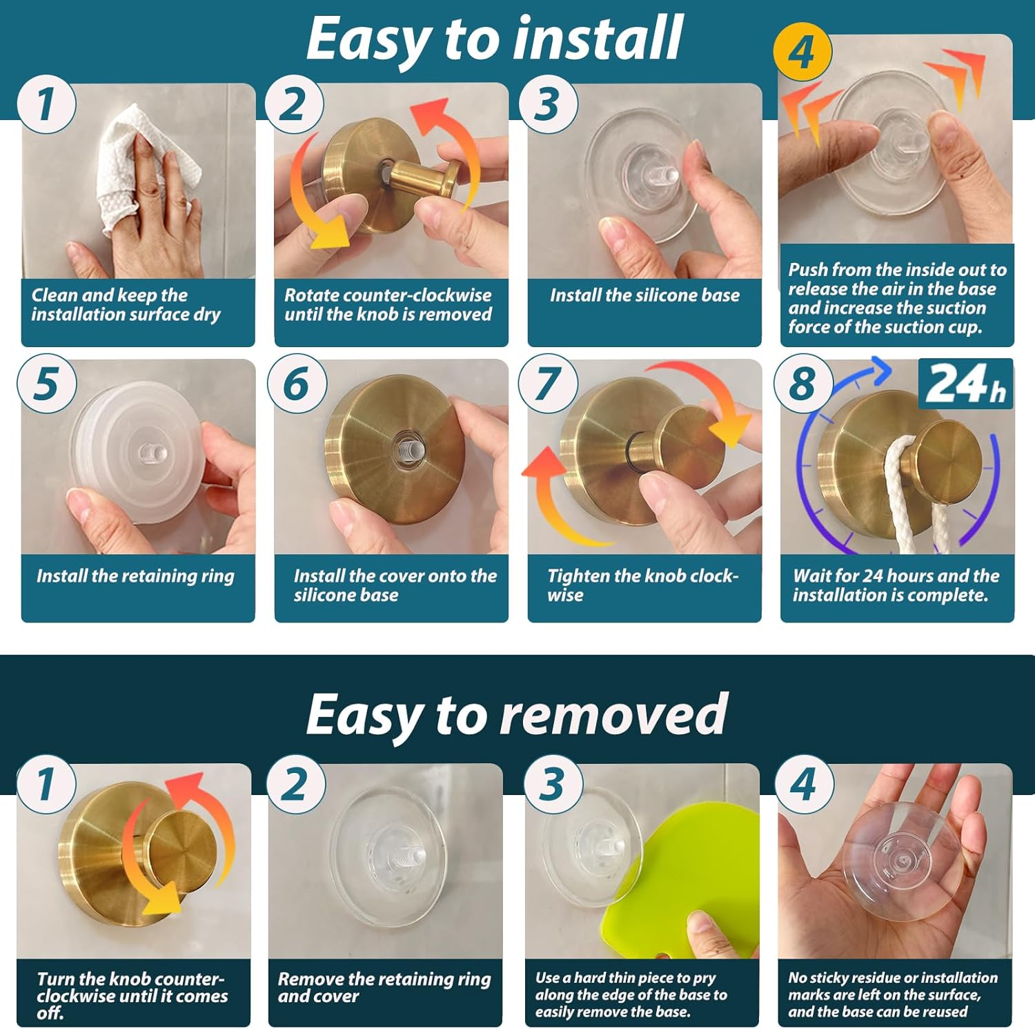 - 【Easy to Install and Use】 AbluFirst shower hooks do not damage walls during use. Just choose a smooth surface, twist and lock, and it’s done quickly. (Please refer to the instructions for detailed steps) The high-quality suction cup adhesive can be easily removed or repositioned without leaving sticky residue or installation marks.