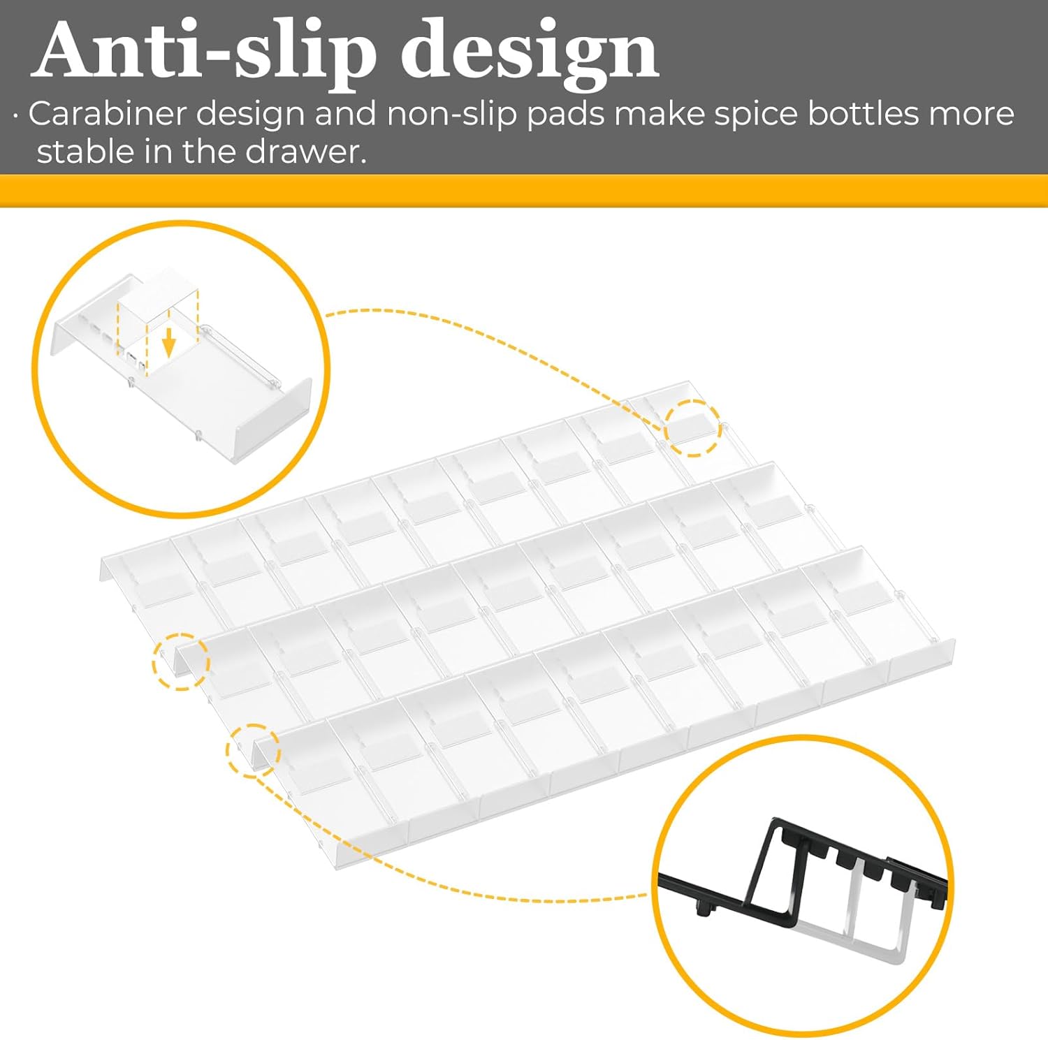 - Easy Assembly: No Tools Required! Our drawer spice rack is easy to install and use. Simply place the inserts in your drawer and adjust it to the desired size. Keep your countertop neat and tidy.