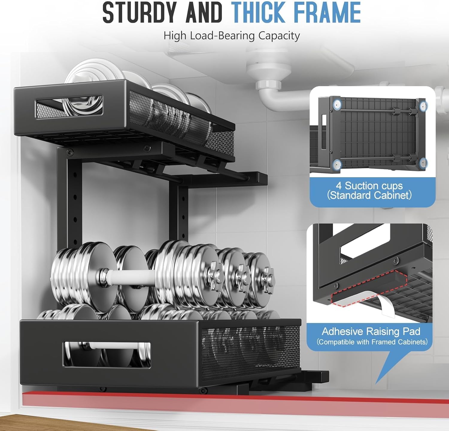 - 【2-Tier Pull-Out Design for Easy Access】This under-sink organizer features a double-layer pull-out design, allowing you to easily access items at the deepest part. The upgraded, thickened iron circular sliding rails ensure a smooth and seamless pulling experience, making each use effortless. The unique pull-out locking mechanism effectively prevents the drawers from being completely pulled out, avoiding the risk of items falling or structural damage caused by over-pulling, ensuring safer and more convenient use.