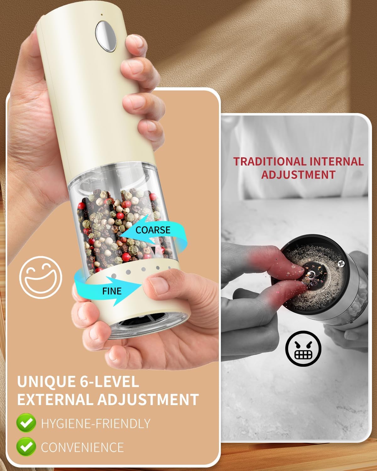 - ✔️USB CHARGING - The Type-C cable makes charging more convenient. Effortlessly recharge the salt and pepper grinder set anytime, anywhere, with the included USB-C cable. A full charge takes less than an hour, eliminating the need for frequent battery replacements and guaranteeing uninterrupted use(USB cable compatible with 5V adapter)