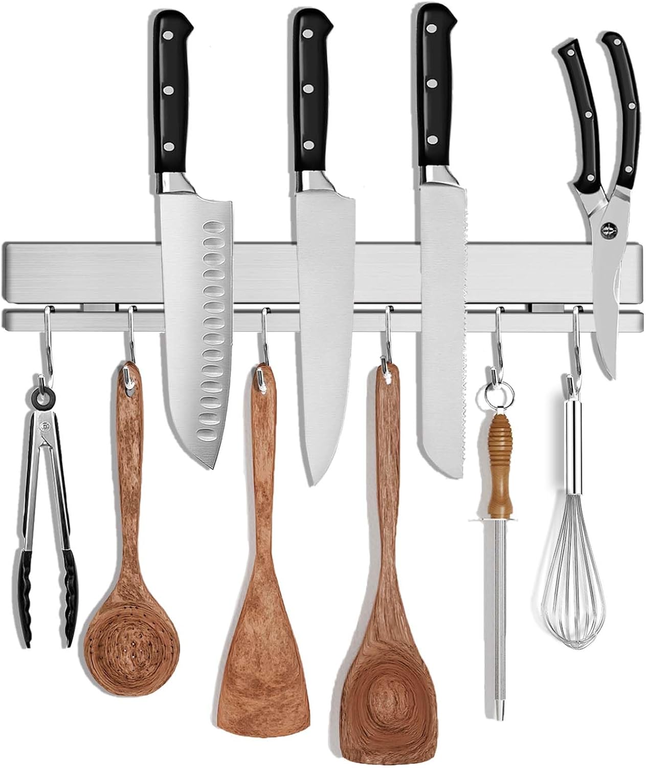 - 【12" Multifunctional Storage with 6 Hooks】Our upgraded 12-inch kitchen knife magnetic holder holds knives and includes 6 dedicated stainless steel hooks. This magnetic tool holder strip eliminates clutter by storing knives, tools, and utensils