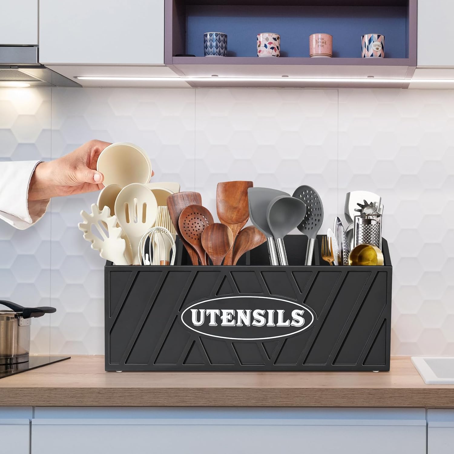 - 【Stylish Utensil Crock for Kitchen Decor】The combination of carving and printing gives this wooden utensil holder a charm of both modern decor and farmhouse decor. The unique design of spatula holder complements any kitchen decor, blending seamlessly into your existing kitchen aesthetics. If you want to free up your counter space and give your kitchen a new look, this practical and stylish kitchen countertop organizer is the perfect choice for you. Great for small kitchen or tight counter space