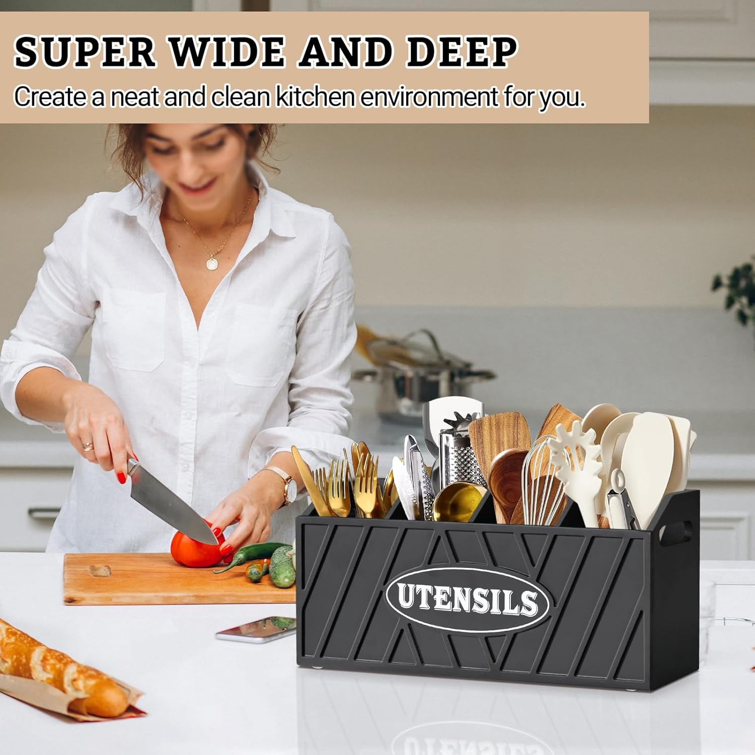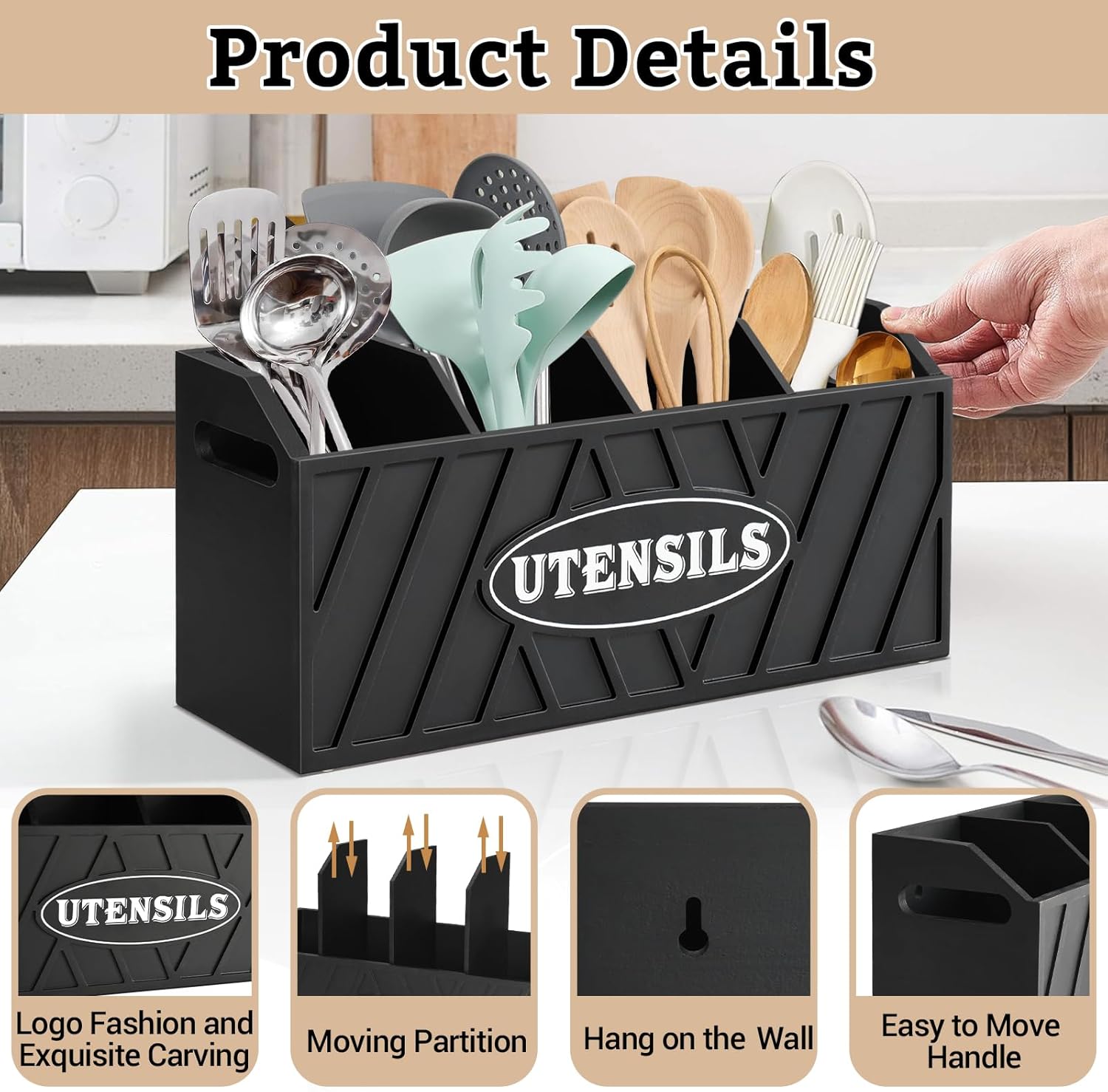 - 【Large Utensil Holder with Handles】Our kitchen utensil holder has 4 compartments, which is spacious enough to hold utensils. The dividers of utensil organizer for kitchen counter is movable, which can sort your spatula, spoon, knives, tongs and other cooking tools orderly. Keep your utensils at fingertips instead of digging through a drawer. Handles on both sides allow you to move utensil caddy easily. This cooking utensil holder is a must-have for anyone who appreciates a well-organized kitchen