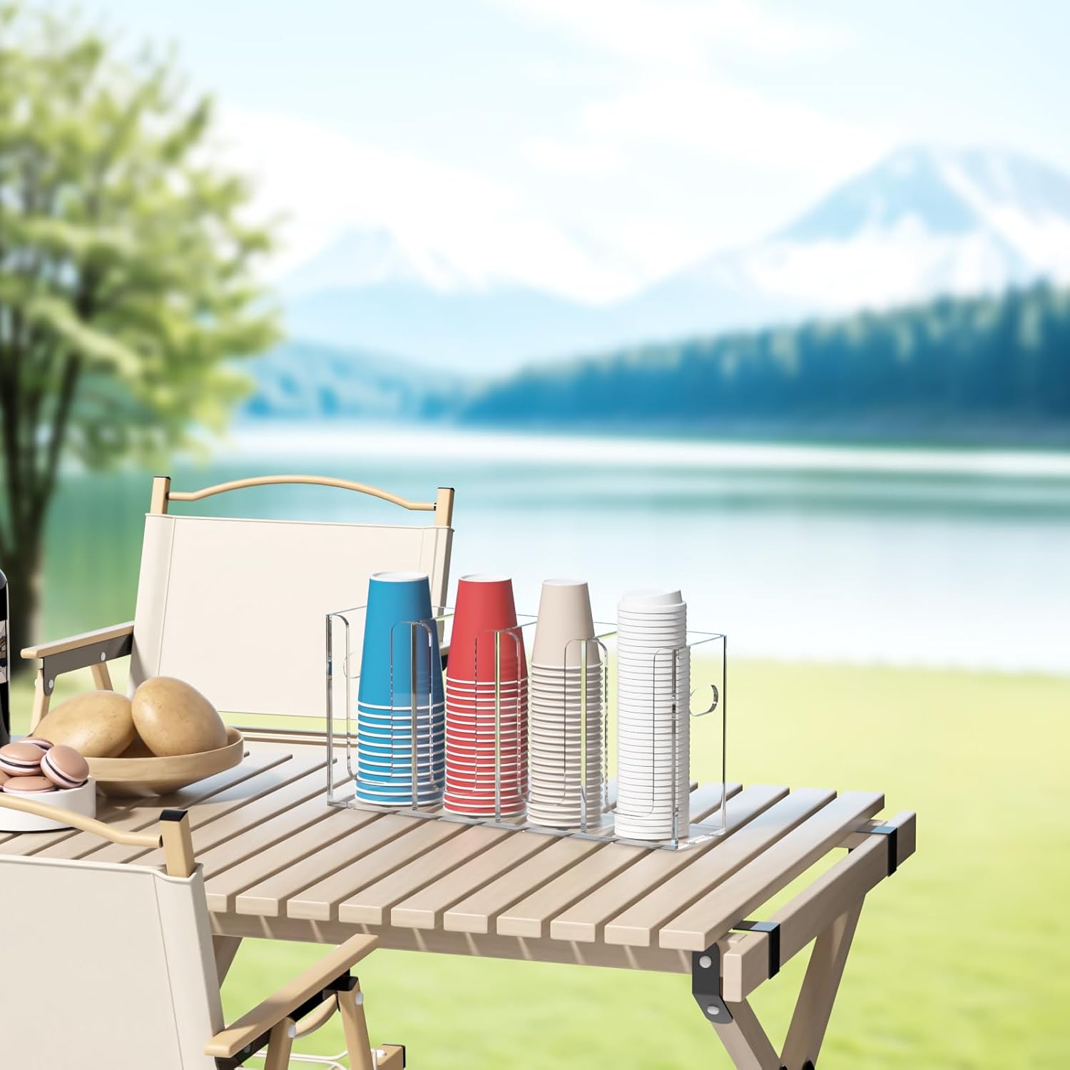 WINFFOR Disposable Cup Organizer Dispenser - 4 Compartments Clear Acrylic Cup and Lid Holder with Handles Plastic Cup Dispenser Countertop Paper Cup Holder for Coffee Bar House Party Essentials